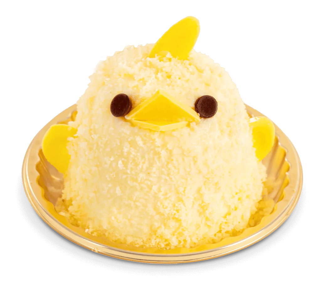 名古屋コーチンの卵を使用した、ひよこ型が可愛いケーキの「ぴよりん」。プリン入りのババロアを土台に、粉末状にしたスポンジ生地をまぶすことで、ぷるぷるふわふわの食感を実現しています。