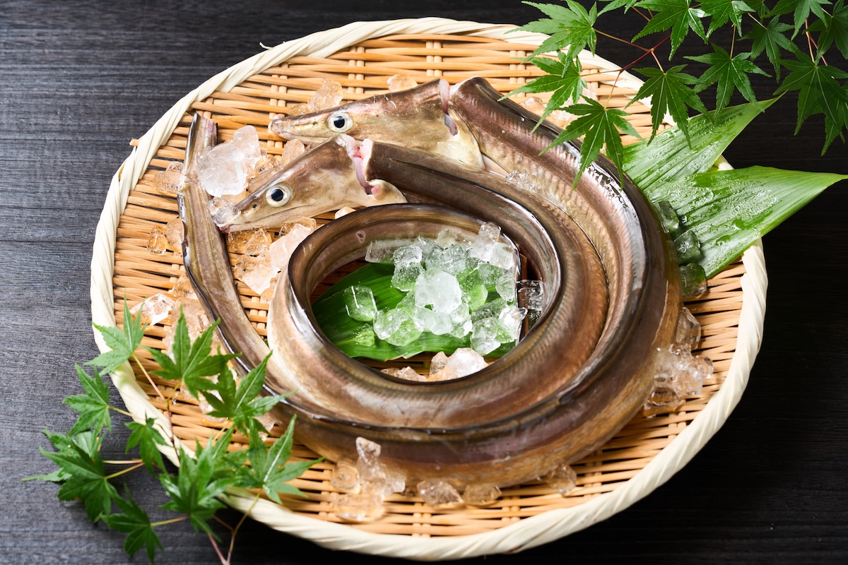 淡路島で鱧を調理する職人たちは、調理法によって鱧の大きさを選ぶ傾向があります。骨きりした鱧を湯引きにした鱧落としには小ぶりの鱧、鱧すきには、油の乗った1.5kg前後の鱧を使います。