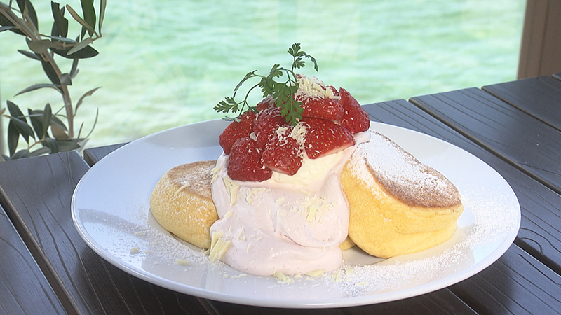 看板メニューの「幸せのパンケーキ」は、ニュージーランドから直輸入する高純度のマヌカハニーと北海道の生乳から生まれた発酵バターが自慢。ふわふわと厚みのある生地はしっとりなめらかな口当たりで、一見ボリュームがありますが、ひとりでもペロリと食べられる軽やかさ。淡路島の美しい景色と一緒に堪能できます。