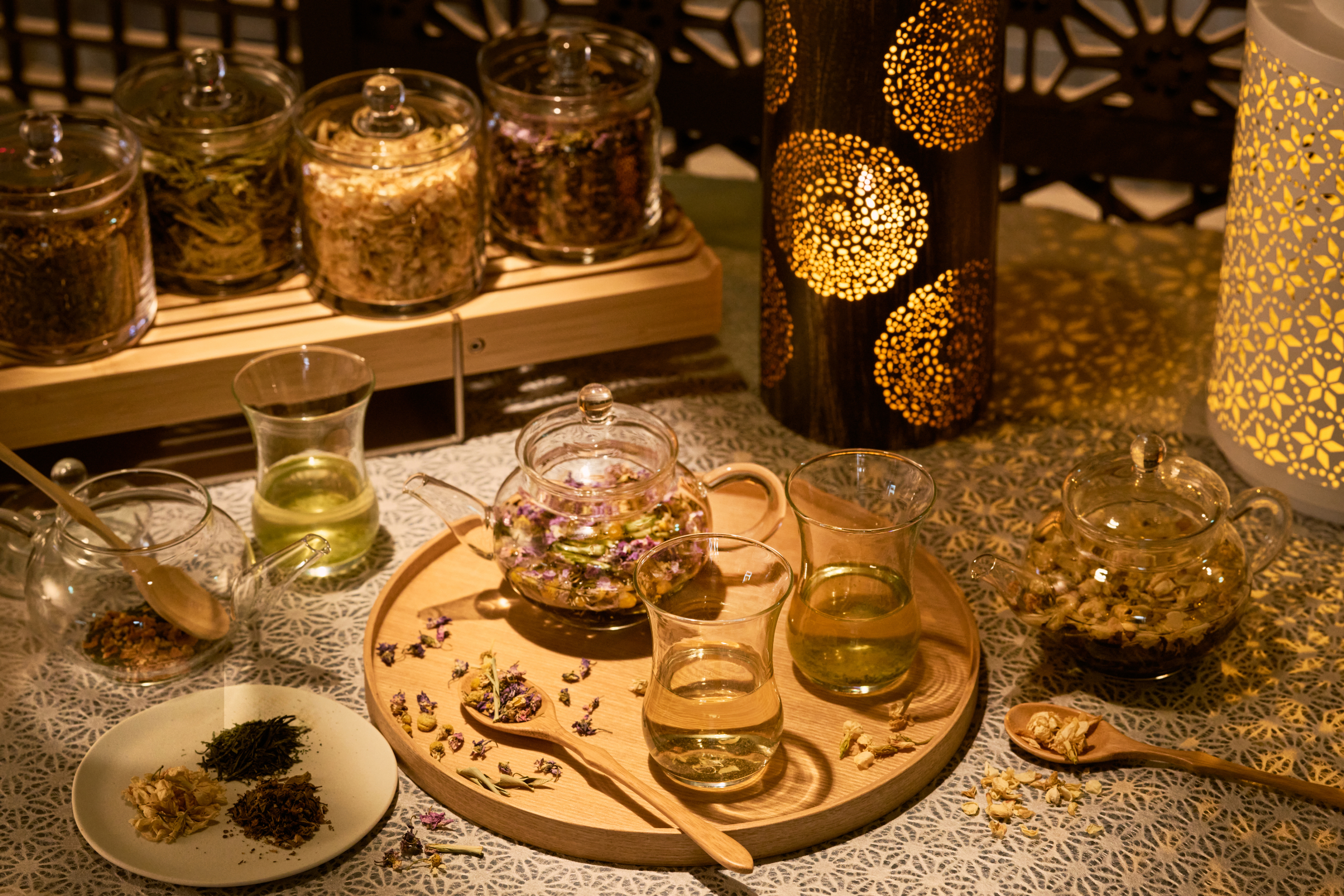 まんだらランプアートをひとしきり鑑賞したあとは「煎茶とハーブティのブレンド体験」を。ハーブは京都の専
