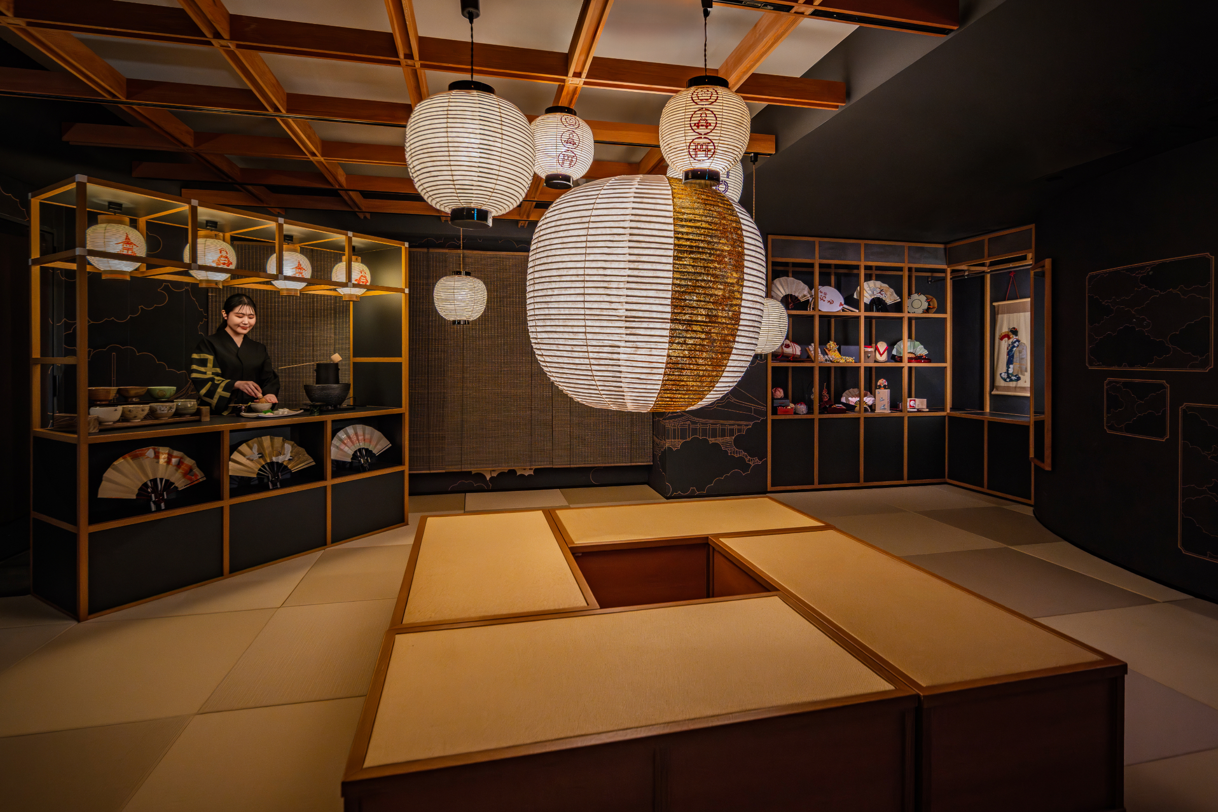 「祇園宵のおも茶話会」は、そんな花街文化の趣を気軽に体験できるイベントです。装飾は祇園の花街の華やかさをイメージ。江戸時代創業の老舗『小嶋商店』の提灯と床一面の畳をOMOベースに設え、夜のお座敷ムードを演出しています。