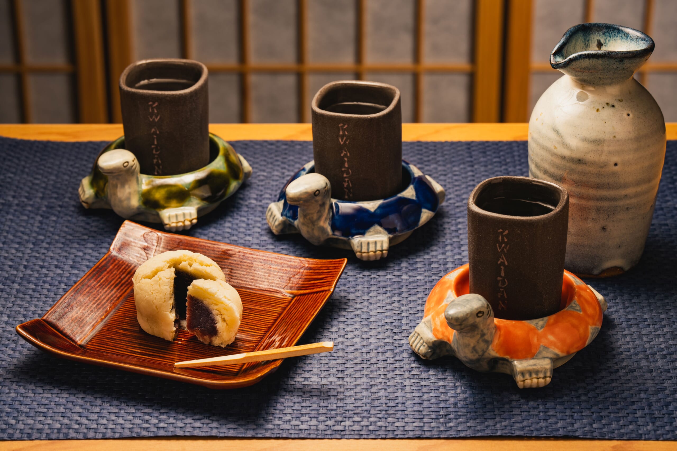 日本酒は相性の良いにごり酒、八雲が隠岐の島で飲んだとされるお酒の逸話を元に再現したもの、そして八雲ゆかりの地・熊本の酵母と島根の酒米を掛け合わせたコラボレーション酒の3種が用意されています。八雲が愛したとされる和菓子とお酒の組み合わせ。先ほどご紹介した『怪談茶室』で怪談を聴きながら味わうこともできます。