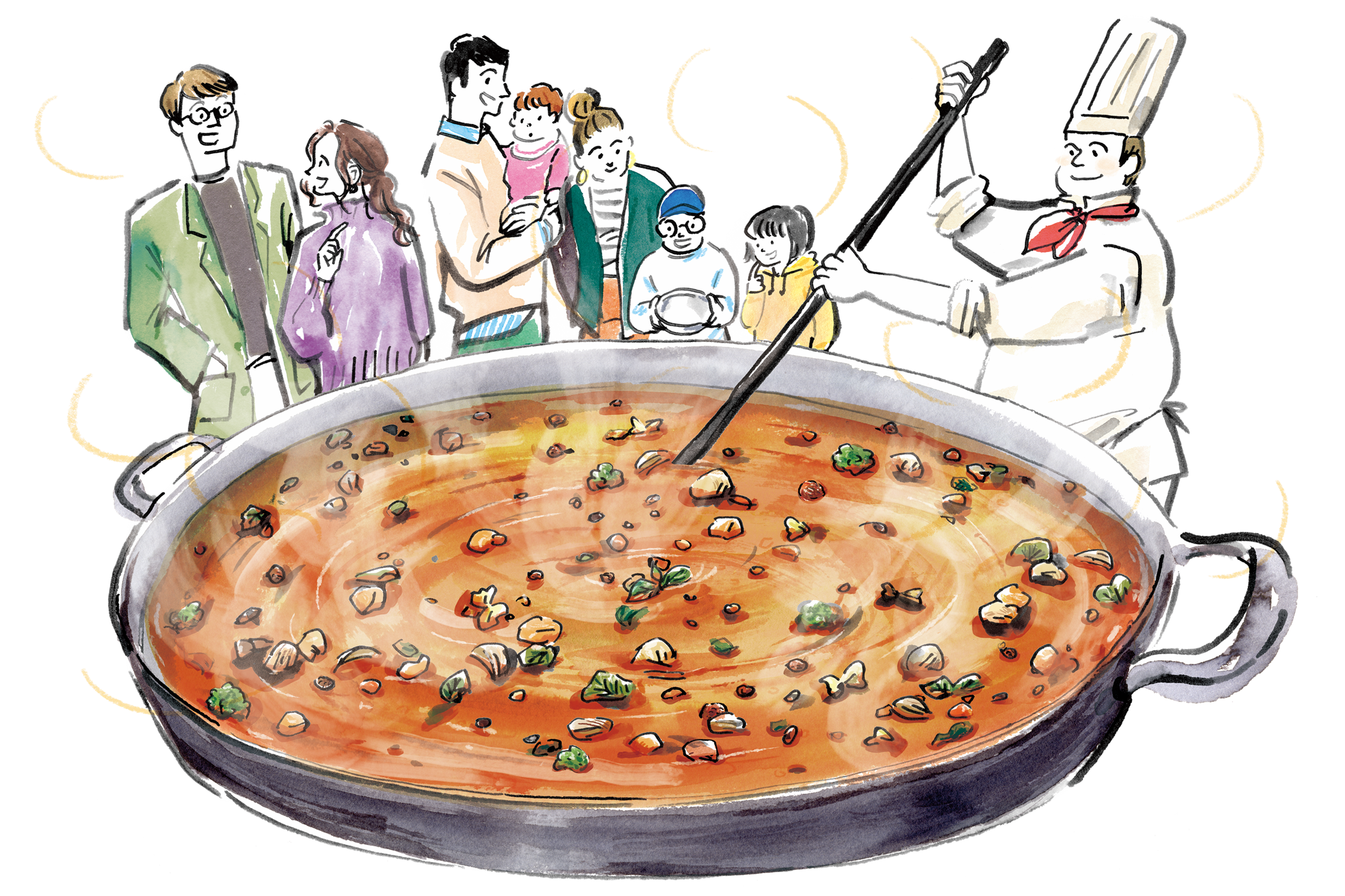 山梨県内で飲食店を営む料理人たちが作る、ワインによく合う野菜や肉料理、おつまみ、スイーツなどの料理も大集結します。施設の中央に位置する「アルプス広場」には、大鍋で作る「ワインほうとう」が登場! これはイタリア・トスカーナ地方の伝統的スープ料理『リボリータ』に着想を得たもので、山梨の郷土料理ほうとう「みみ」と山梨県の白ワインを隠し味に使ったダイナミックな料理。バラエティ豊かなグルメをワインと一緒に味わってみて。