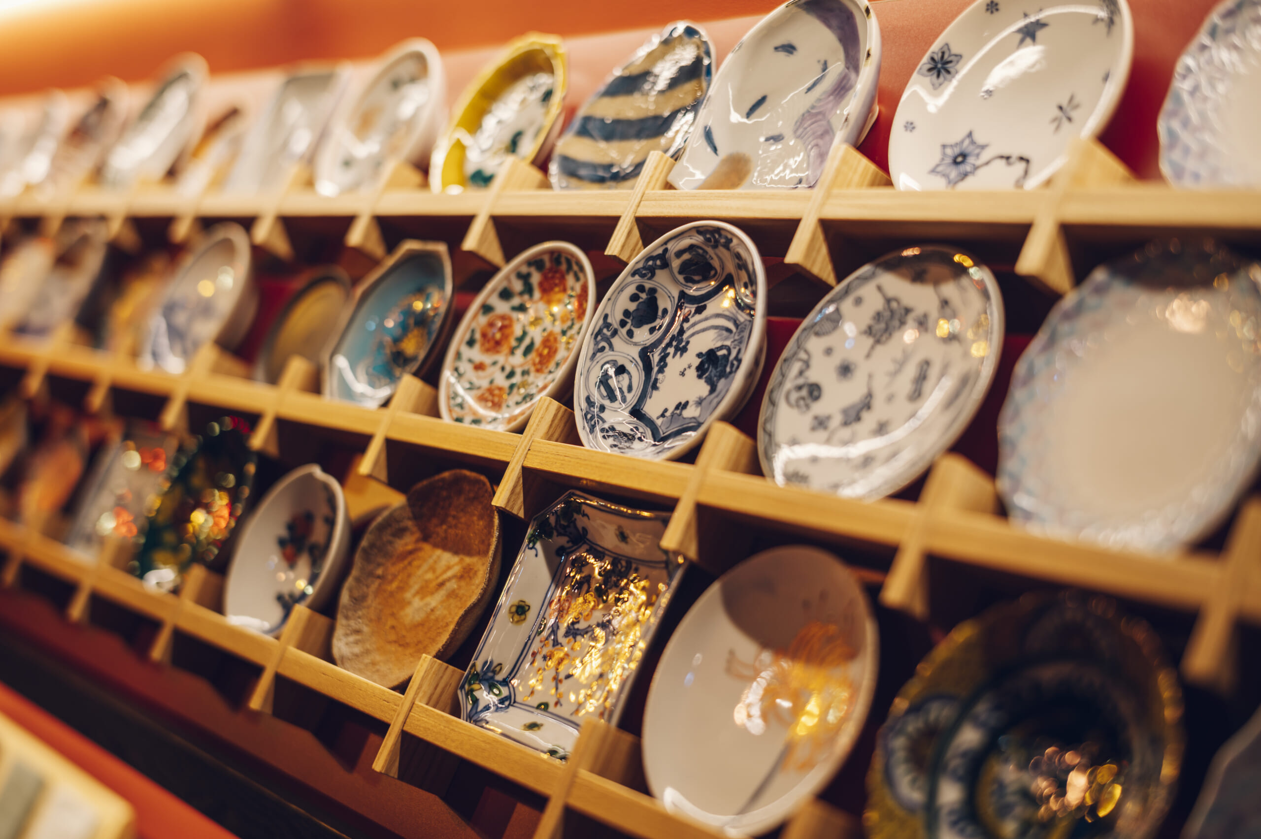 「蟹面」が提供されるのは、加賀の地に根付く伝統工芸『九谷焼』の器です。これは地元加賀の窯元「萌窯(もえがま)」が蟹面に合わせて特別に制作したオリジナル品。スタッフと作家さんが議論を重ねて創り上げた唯一無二の器は、べんがらラウンジから臨む「湯の曲輪(ゆのがわ)」の冬景色に映える華やかな仕立てになっています。