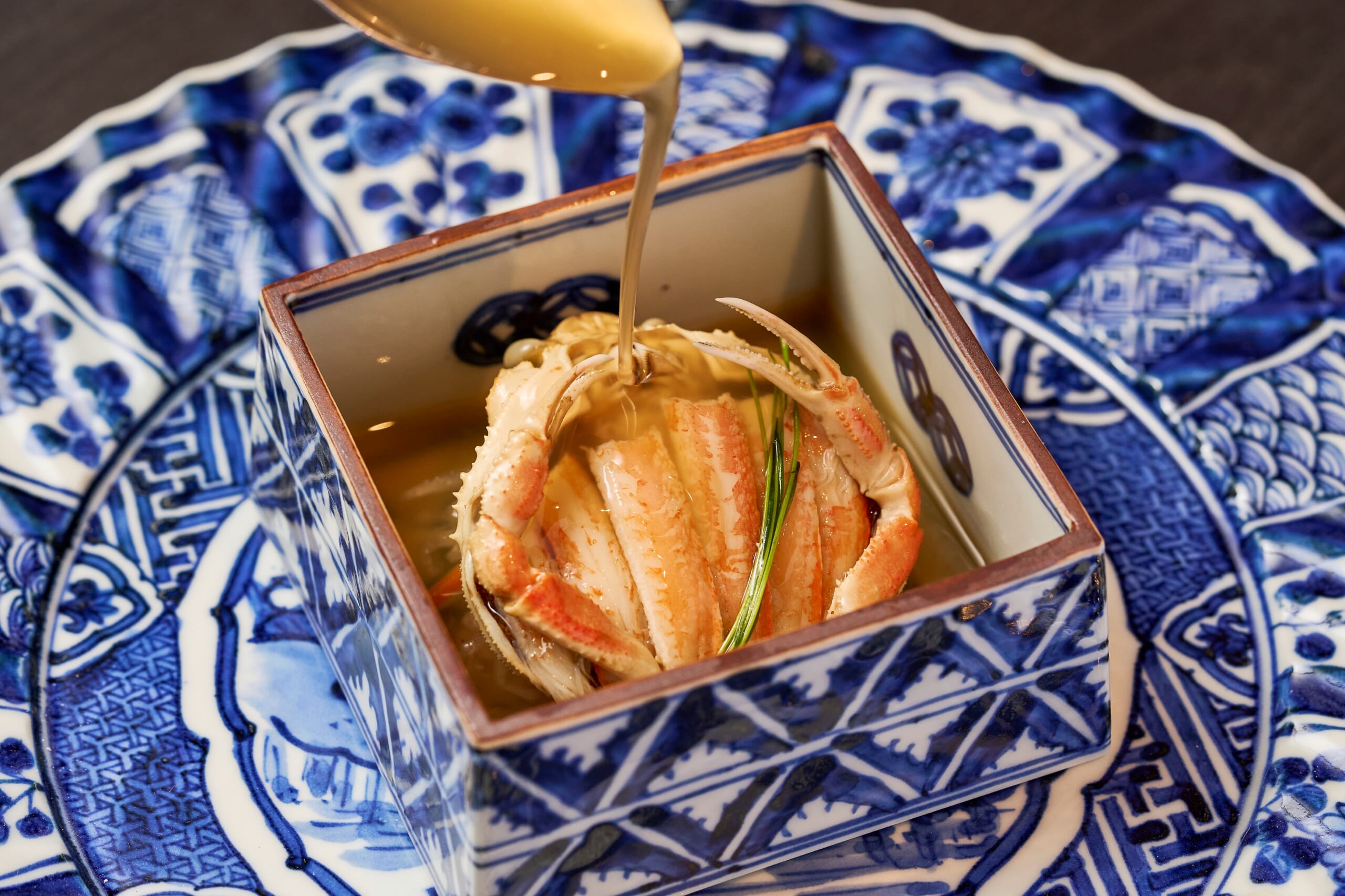 石川県には、ズワイガニをおでんの具材「蟹面」として味わう食文化があります。仕上げにとろりとした出汁の餡をかけるのが、界 加賀のこだわり。蟹はお酢などを付けて食すのが一般的ですが、出汁をまとった「蟹面」は他にはないマイルドな味わいに仕上がります。