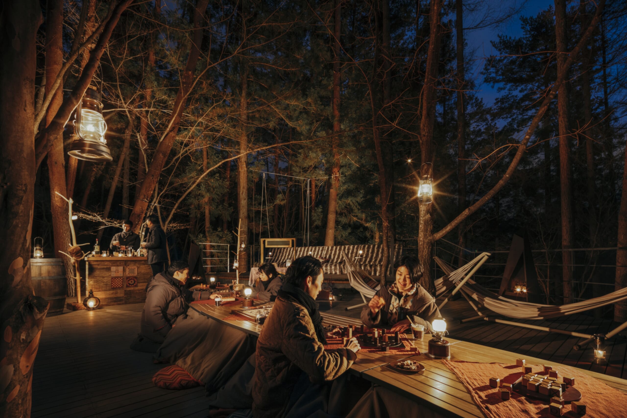 木漏れ日デッキには、こたつに入ってゆったり寛げる「森ごもりラウンジ」が登場。焚き火のはぜる音をBGMに、家族や友人とボードゲームに興じるもよし、1人もの思いにふけるもよし。冬の夜だからこそ感じられる森の静けさ、澄んだ空気、美しさを満喫できるリラックス空間になっています。