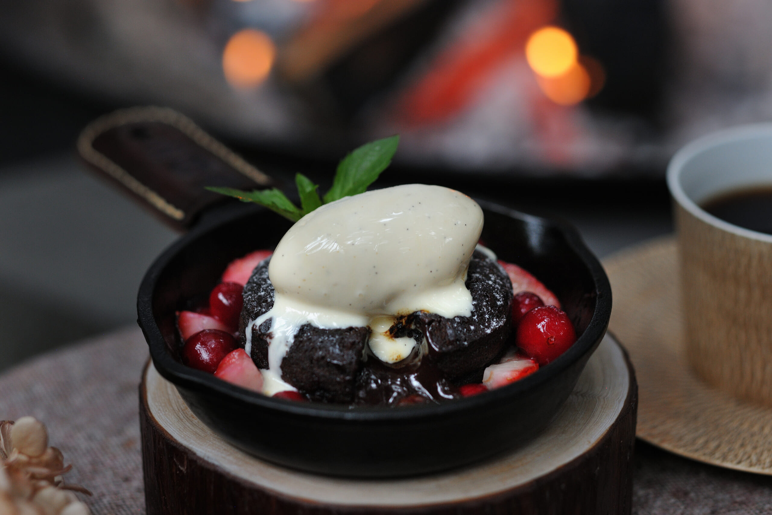 午後のクラウドテラスで楽しむ「森のひととき」では、燻製フォンダンショコラが提供されます。林檎チップのスモークで香りづけした濃厚なフォンダンショコラに、バニラアイスとベリーソースをトッピング。とろけるショコラの甘さとスモーキーな香りがマッチした、冬限定のご褒美スイーツです。冬の森の静けさの中で、贅沢なスイーツタイムを過ごしましょう。