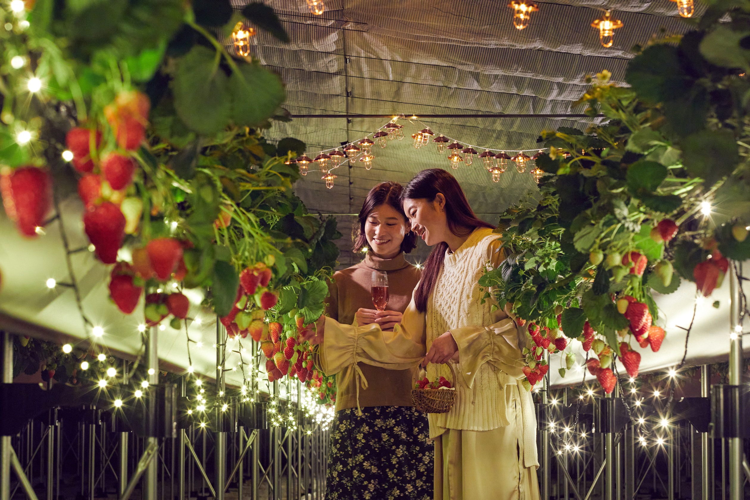 1日1組限定の空間でブランドいちご「紅ほっぺ」を思う存分堪能できるだけでなく、摘みたていちごを贅沢に使ったクレープシュゼット、紅ほっぺを使用したオリジナルカクテルなども楽しめます。ライトアップされた夜のいちご畑で “いちごづくし” の夜を満喫してみて。