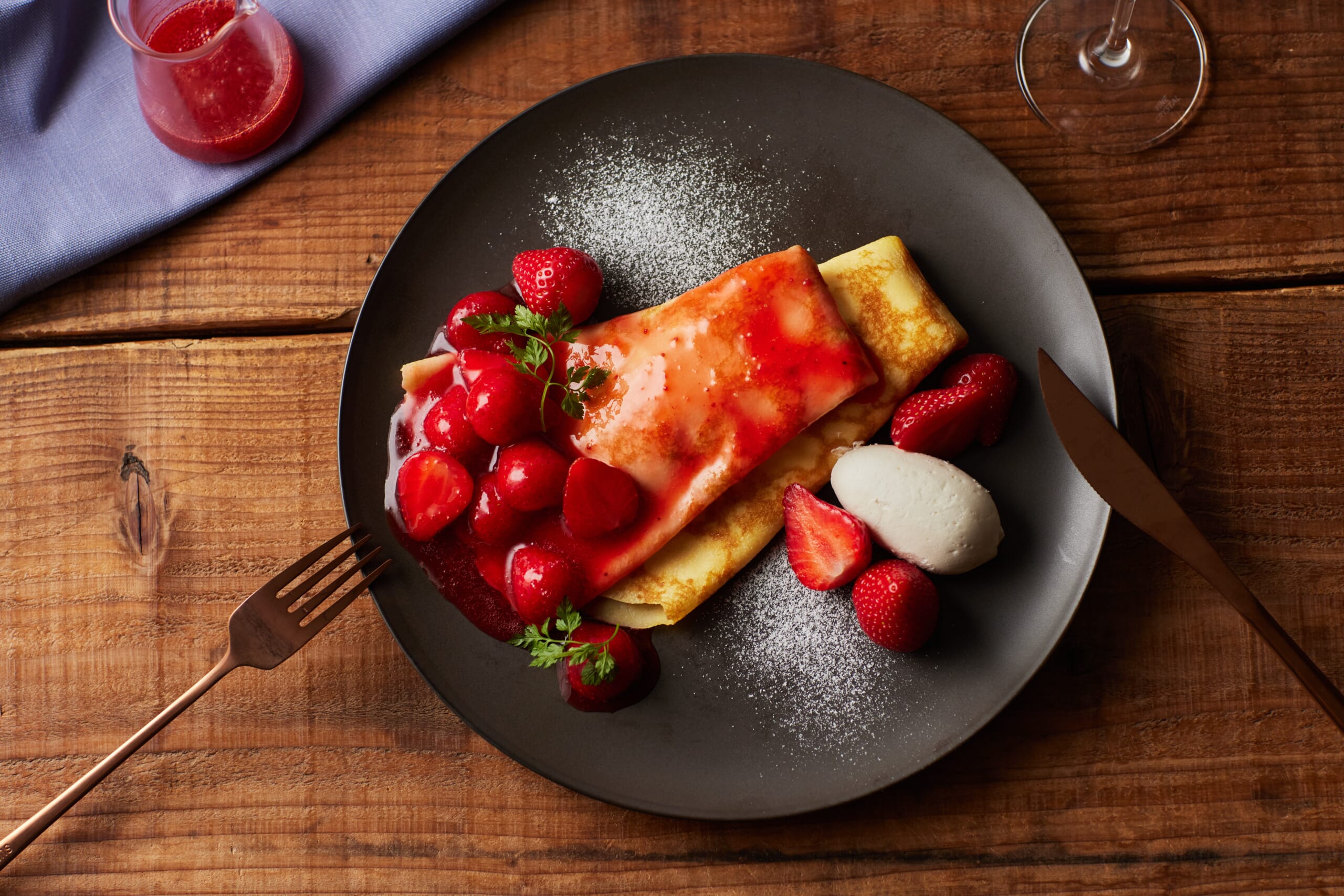 いちご狩りを満喫したあとは、摘みたての「紅ほっぺ」をふんだんに使ったクレープシュゼットを作ります。リキュールといちごを煮詰めた特製ソースを焼きたてのクレープにかけると、甘く芳醇な香りが広がります。トッピングにはミルクのソルベ。温かいクレープとひんやりスイーツの絶妙なコントラストを味わいながら、夜限定のデザートタイムを楽しみましょう。