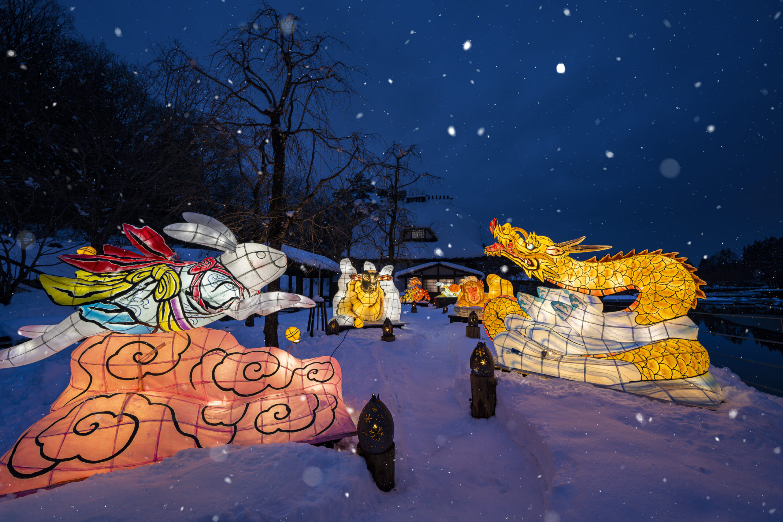 また青森屋敷地内の公園では、雪景色をねぶたが彩る『ねぶた雪灯り』も同時開催。干支と青森にちなんだ要素を掛け合わせた、ユニークな6体の干支ねぶたが登場します。どれも造形が力強く、色使いが鮮やかで、雪原の白とのコントラストがなんとも幻想的。冬の夜散歩が楽しくなるフォトジェニックなスポットです。