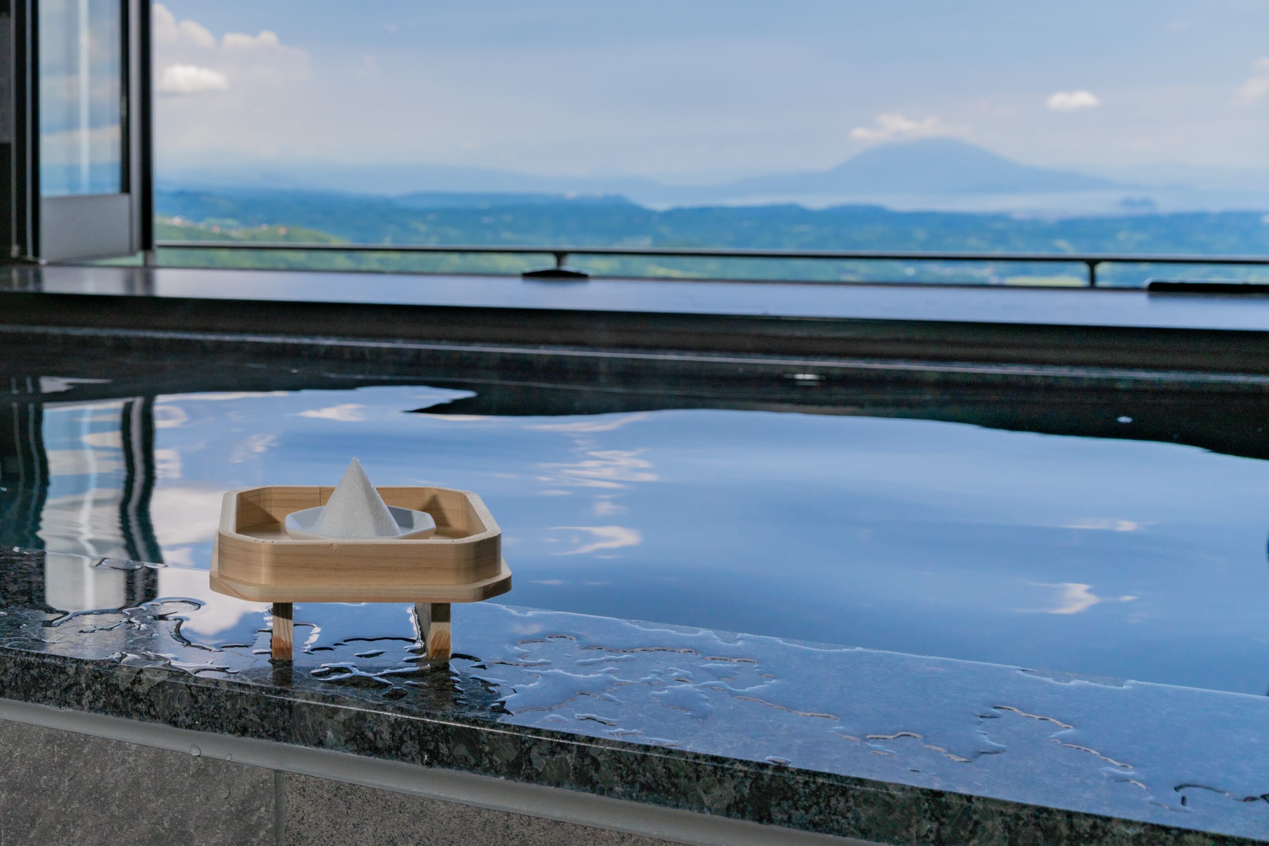 また桜島や錦江湾の絶景を見渡せる客室露天風呂では、霧島神宮への参拝に備えて「撤下神饌の清め塩」で心身を清めます。使用する塩は、霧島神宮で日々斎行される祭典でご神前へお供えされた神饌。神様が嫌う穢れを祓い、思いを届ける準備をする時間です。