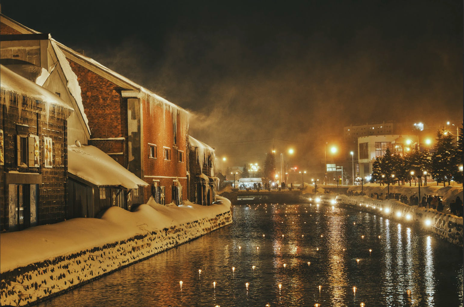 歴史的建造物が並ぶ小樽運河は、小樽へ来たら必ず訪れるべき北海道屈指の人気スポット。「小樽運河こたつクルージング」が開催される日没後は、ガス灯の温かな灯りが雪化粧の運河を照らし、冬ならではの幻想的な美しさを際立たせます。