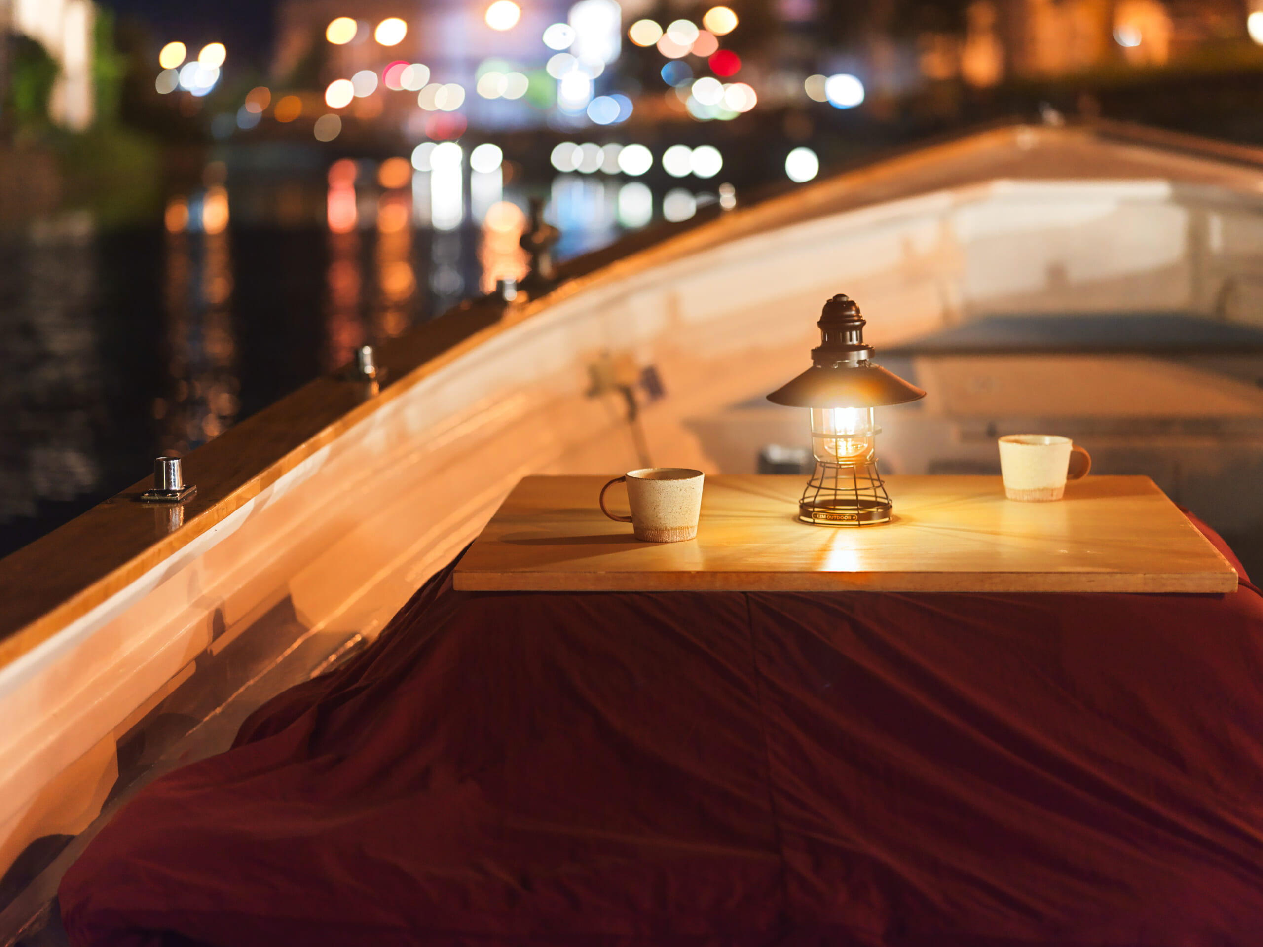 小樽運河クルージングはベンチ席の船で運行するのが一般的ですが、今回のプログラムではこたつを設えた専用の船に乗船できます。寒さが厳しい小樽の野外で、ポカポカのこたつに包まれる時間はまさに最高の贅沢。約40分間のクルーズ中は、白銀の小樽の街並みを堪能しましょう。ランプの光で灯された船は夜景の一部と化し、ゆっくり運河を進みます。
