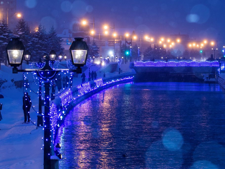 また1月までは、小樽運河が青い光でライトアップされるイベント「青の運河」が開催中。日没から22:30の間は運河が青色の電飾で彩られます。特に日没後の “ブルーアワー” と呼ばれる時間帯は、空の蒼とイルミネーションの青がロマンチックな風景を演出。船上の特等席から眺めてみて。