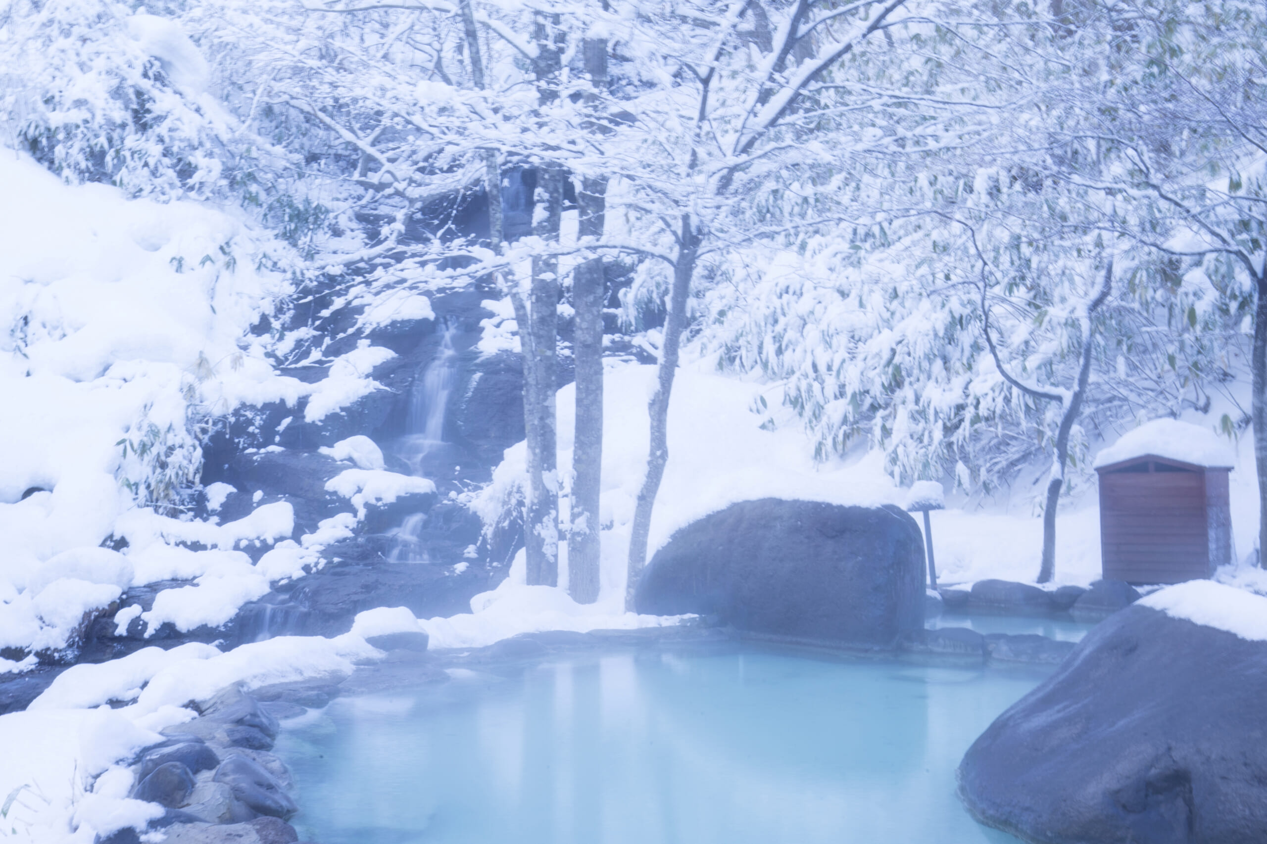 奥入瀬渓流ホテルが誇る『八重九重の湯』は、渓流を目の前に臨む秘境温泉。とくに冬の時期は、雪化粧をまとった木々たちに囲まれ、秘境感あふれる神秘的な姿へと変貌します。湯船の横では高さ7mの滝が岩肌を滑り落ち、その響きわたる水音が、静けさをより一層引き立てます。