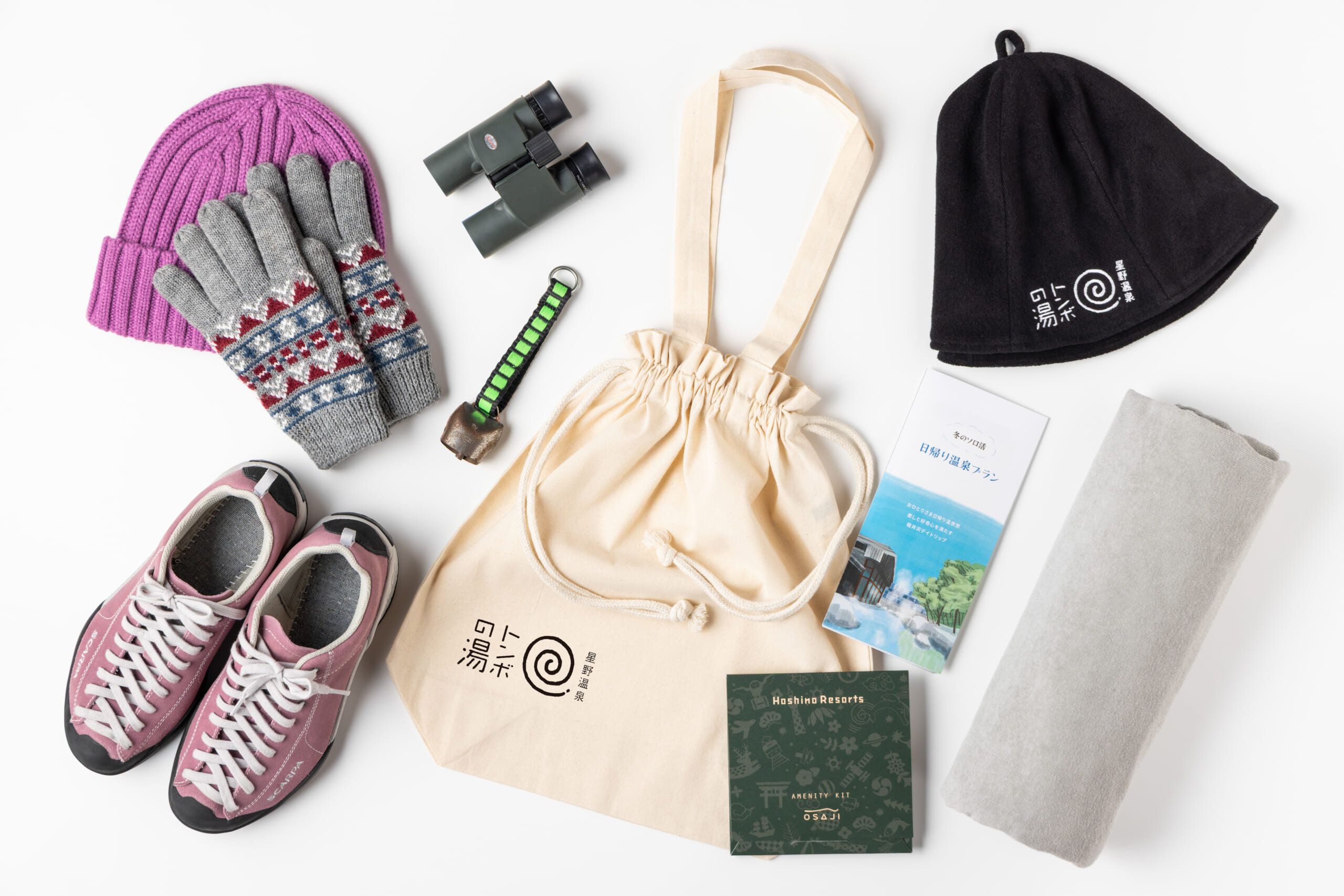 星野エリアに到着したら、まず「星野温泉 トンボの湯」受付へ向かいましょう。ここで渡されるトートバッグには、旅の過ごし方が紹介された「ソロジャーナル」、凛とした冬の森を歩くための防寒ブーツ、湯上りの肌を潤すスキンケアセット、温泉タオルといった、旅を楽しむためのアイテムが詰まっています。