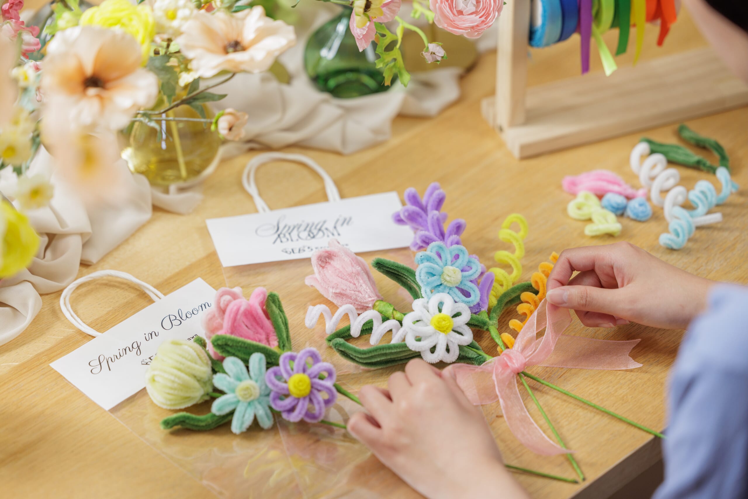 カラフルなモールで作る「モールフラワーづくり」体験にもぜひご参加を。モールをねじったり、まとめたりするだけで、可愛らしいお花を思いのほか簡単に作ることができます。完成したモールフラワーは持ち帰れるので、大切な人へのプレゼントや旅の記念にピッタリ。世界に1つだけの花束を、自分好みにアレンジしてみて。