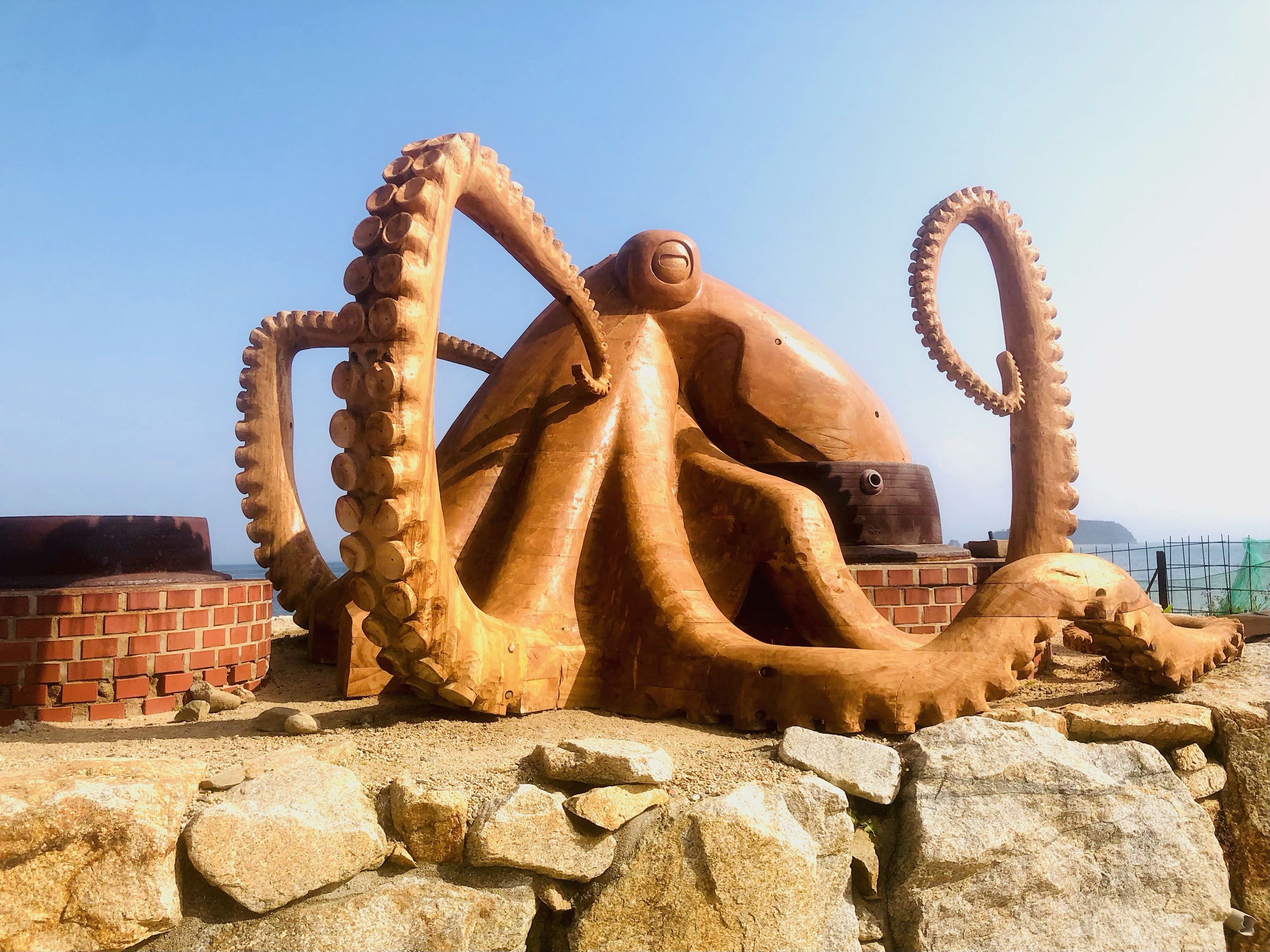 映画村には、瀬戸内国際芸術祭作品3作品が展示されています。木彫刻「ヤザイモン蛸」(尾身大輔)や、カップルに人気の「愛のボラード」(清水久和)は、島の新しいシンボルとなっています。