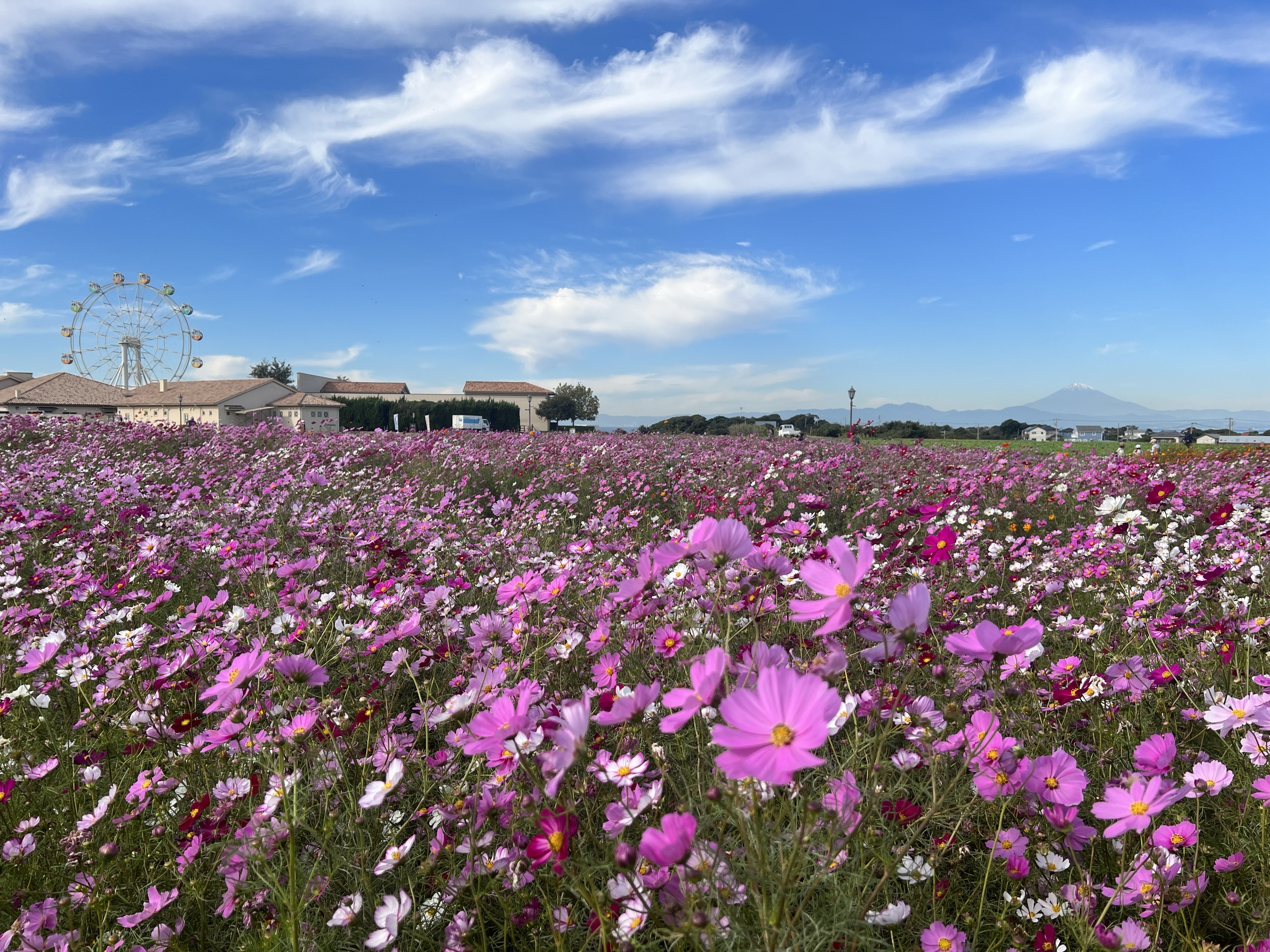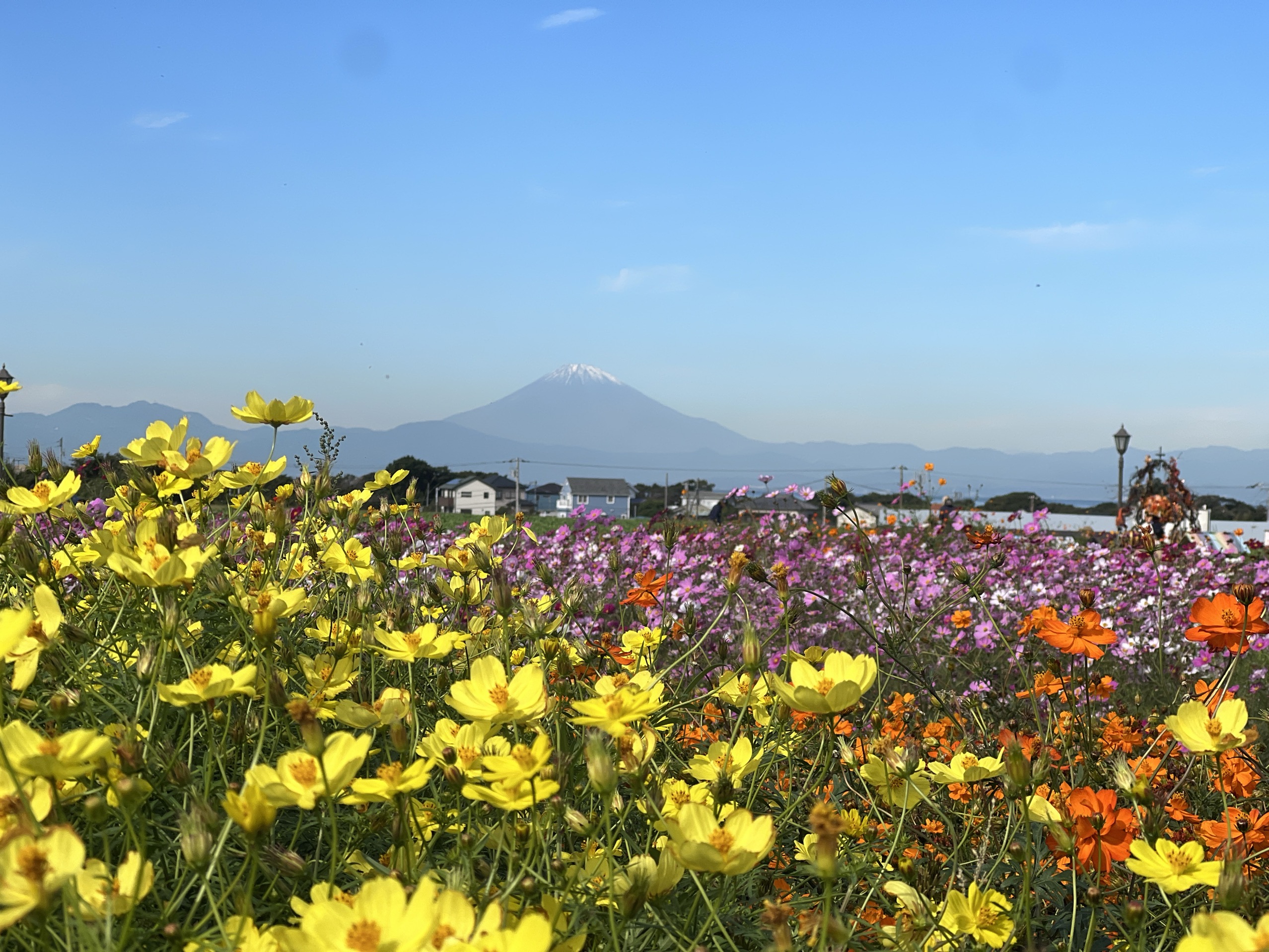 オレンジと黄色のキバナコスモスは、10月いっぱいまで見頃が続く見込み。今週末からコスモスとキバナコスモスが同時に見頃をむかえることになり、ピンク・白・オレンジ・黄色のコントラストが視界いっぱいに広がります。晴れた日は富士山を背景に、色鮮やかなコスモスたちが織りなす絶景を拝めるでしょう。