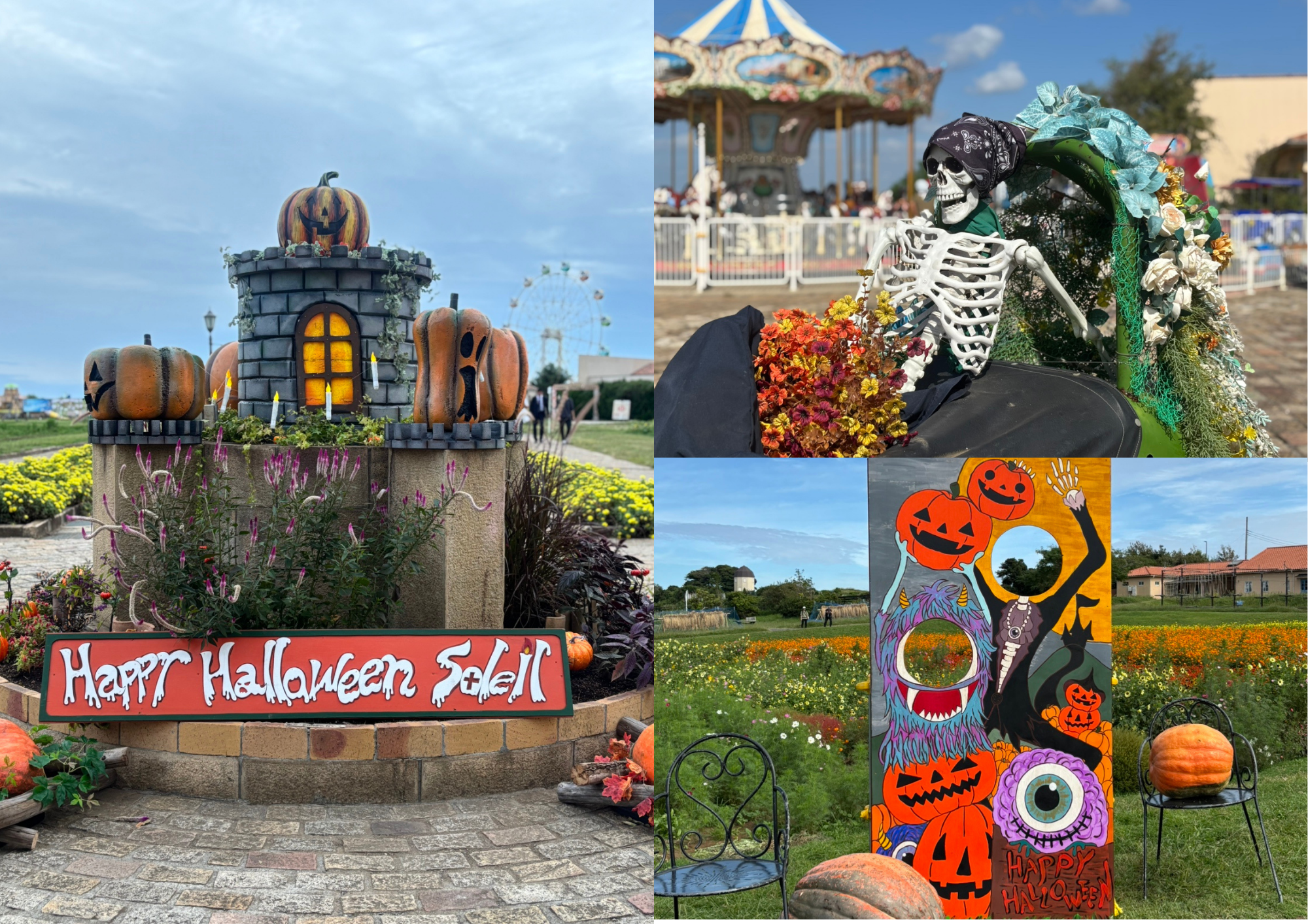ソレイユの丘各所では現在、ハロウィン気分を盛り上げる装飾やおばけたちが登場しています。期間限定のハロウィン顔出しパネルやフォトスポットは、SNS映え間違いなし。可憐なコスモスと、ちょっぴり不気味なハロウィンのオブジェ……夢の共演をお楽しみください。