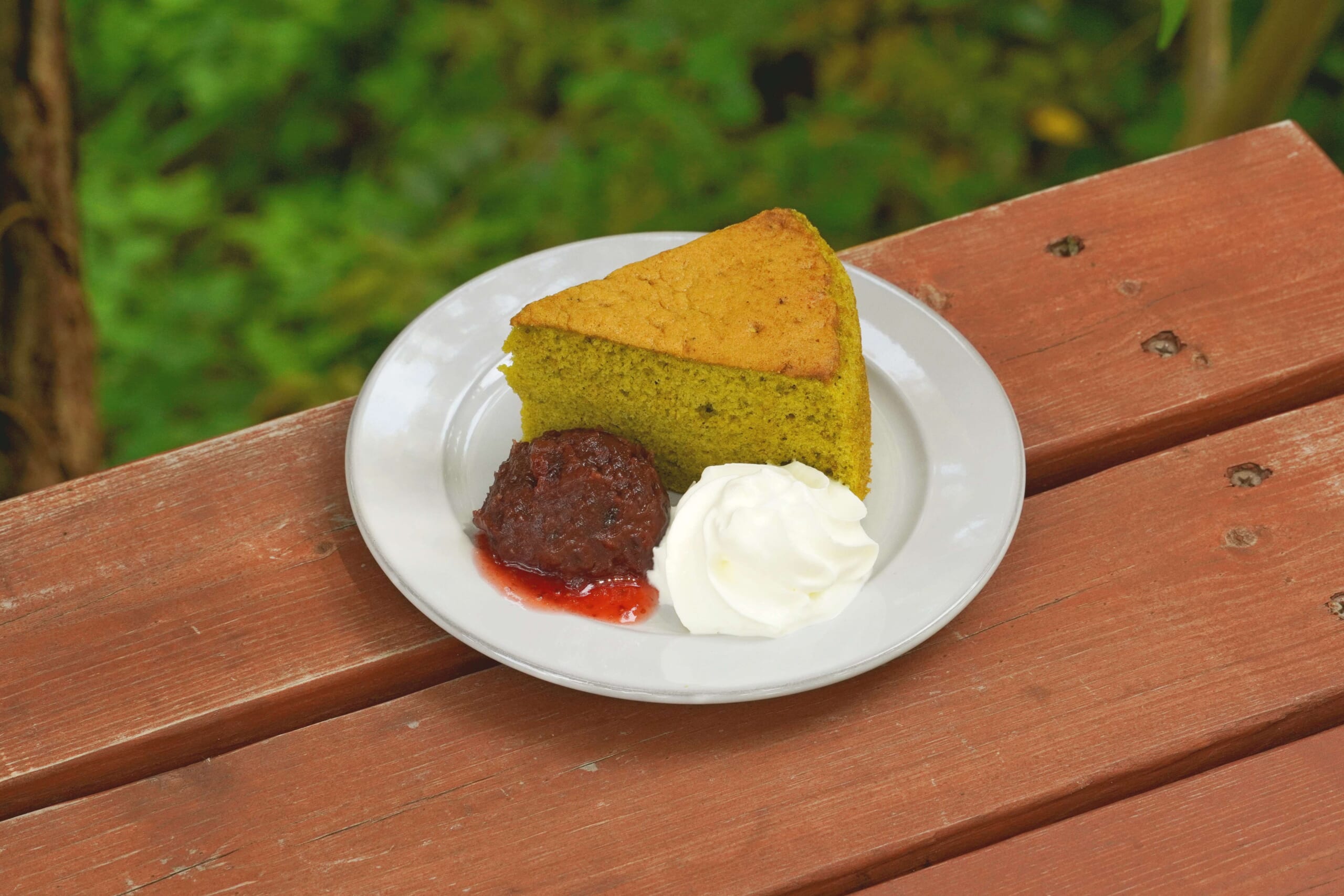 記念の森レストハウスでは、お茶本来の味わいを生かしたメニューが提供されます。オススメは茨城の銘茶「さしま茶」の抹茶と緑茶をブレンドした「抹茶ラテ」。ふんわりした食感の「さしま茶バターケーキ」は、茨城県のブランド卵「奥久慈たまご」と茨城県産イチゴを使用したやさしい甘さに仕上がっています。