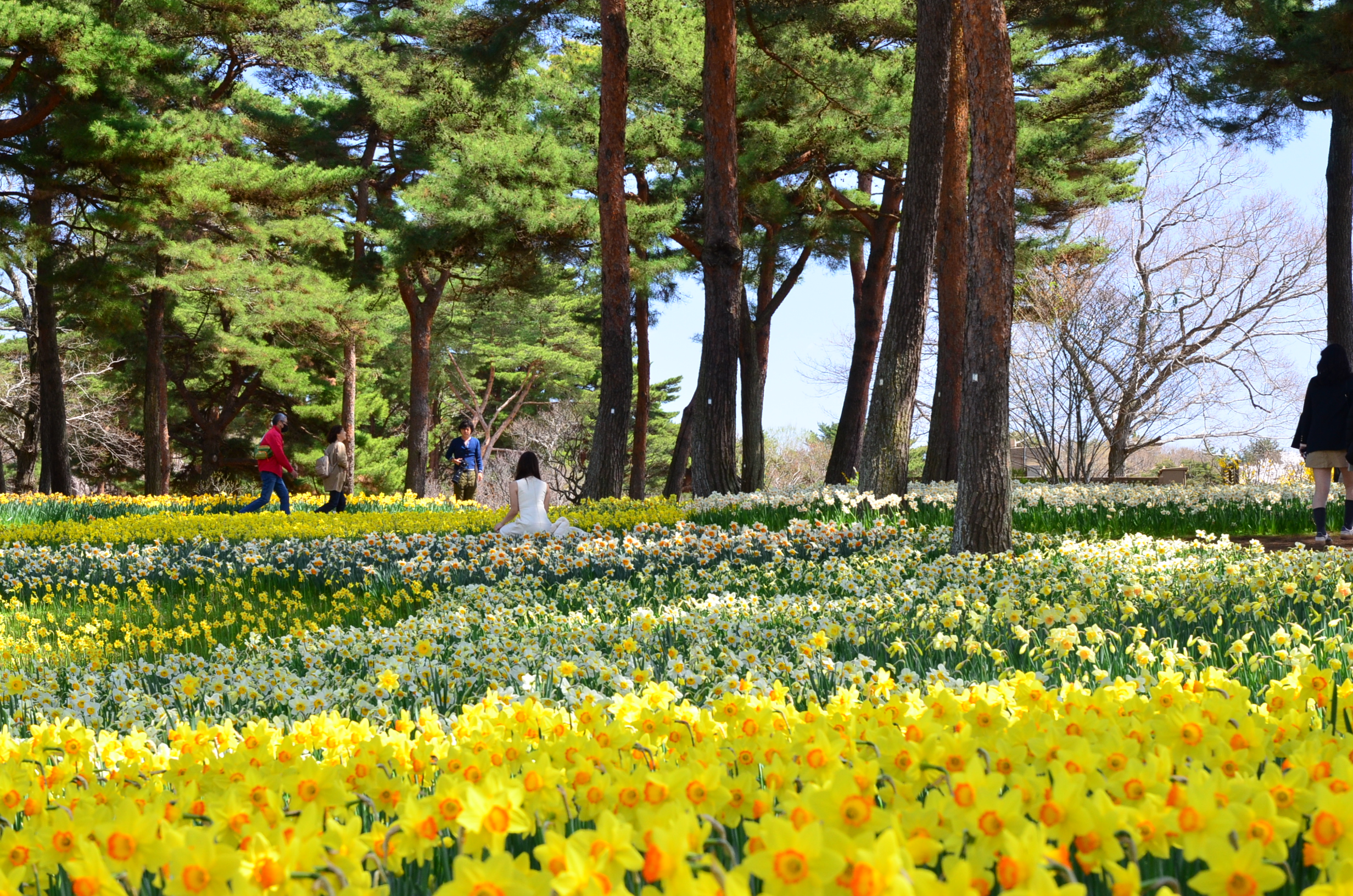 早咲きスイセンに続き、3月下旬頃からはスイセンガーデンにて約100品種・約100万本のスイセンが見頃を迎える予定。木漏れ日が差し込む松林の中でスイセンが咲く景観は、ここでしか見られない独特なものです。