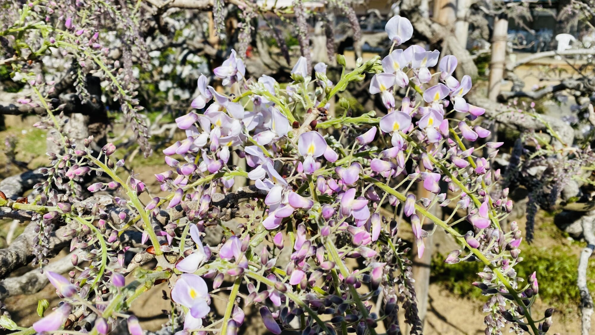 「八重黒龍藤」は、極めて珍しい八重咲きの花房をつける藤で、大藤と同じく栃木県指定天然記念物に登録されています。例年の見ごろは4月下旬〜5月上旬頃ですが、こちらも今年は早まることが予想されます。ボリューミーな花房は、見る者を圧倒する存在感を放ちます。