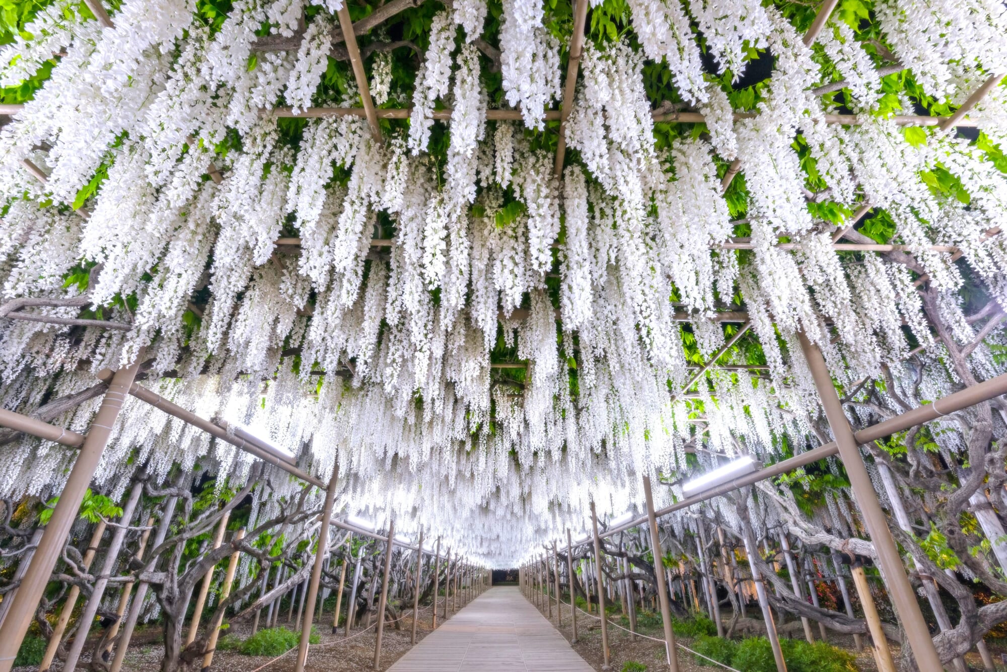 「白藤」も栃木県指定天然記念物に指定されている貴重な存在。例年の見ごろは5月上旬頃で、今年は早まることが予想されます。園内には約80mにわたる白藤のトンネルがあり、真っ白な花房が頭上を覆い尽くす様子は圧巻の一言。甘い香りに包まれながら歩ける特別な体験です。