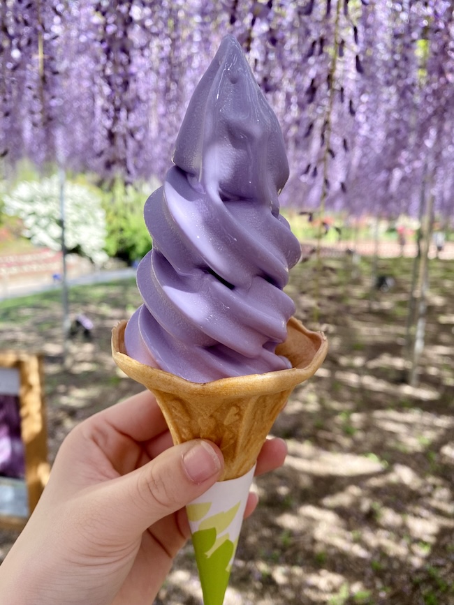 あしかがフラワーパークスイーツの「絶対的エース」と称される「藤ソフト」は、甘く華やかな藤フレーバーのソフトクリーム。訪れたらぜひ試してみてください。