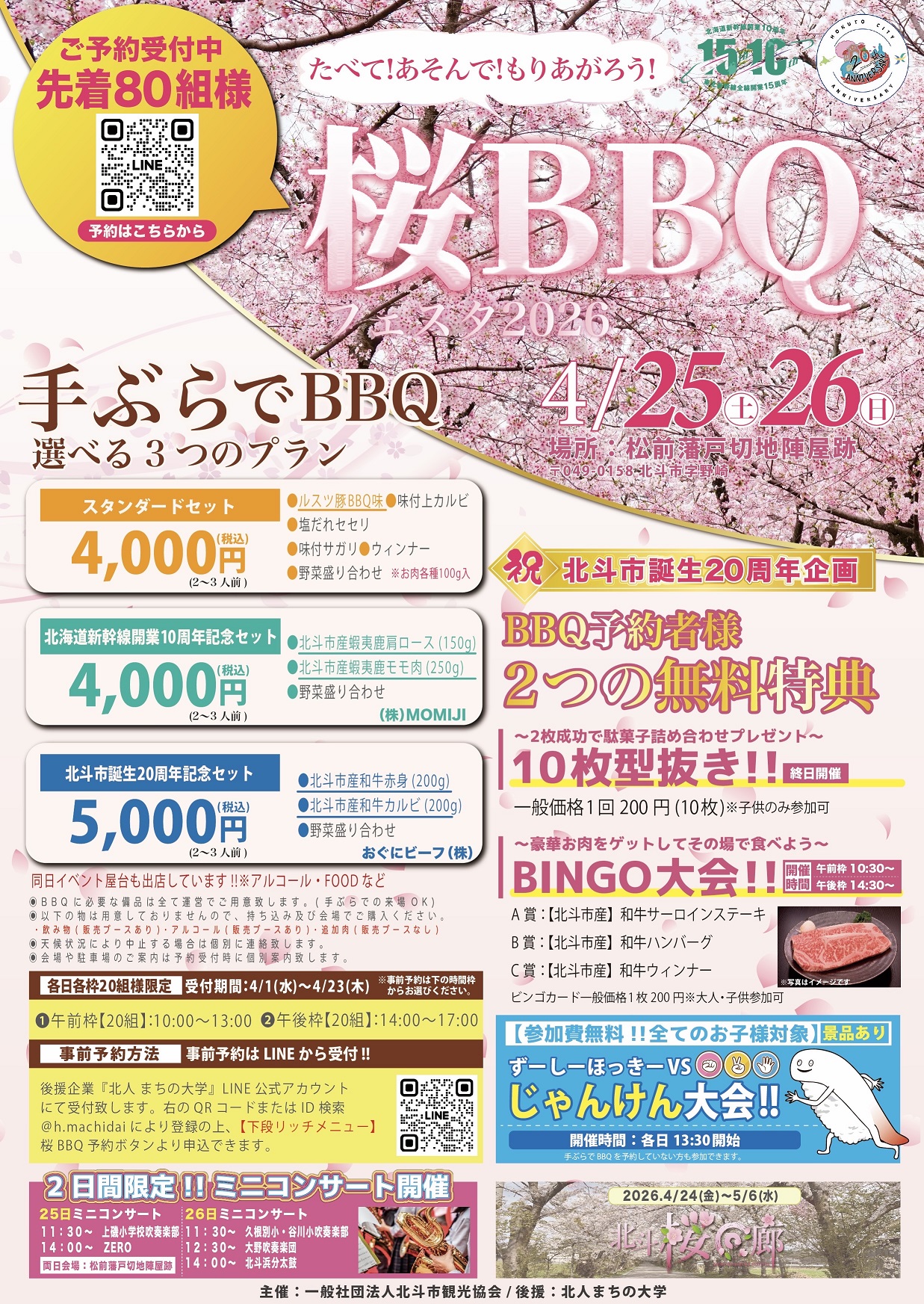 『北斗桜回廊』期間中、北斗市内では様々な催しが同時開催されます。中でも『桜BBQフェスタ2026』(4月25日・26日)は、先ほどご紹介した松前藩戸切地陣屋跡を会場に、お花見をしながらバーベキューが楽しめるというスペシャルイベント。北斗市産の鹿や和牛を堪能することができます。しかも手ぶらでOK。予約枠には限りがあるのでお早めに!