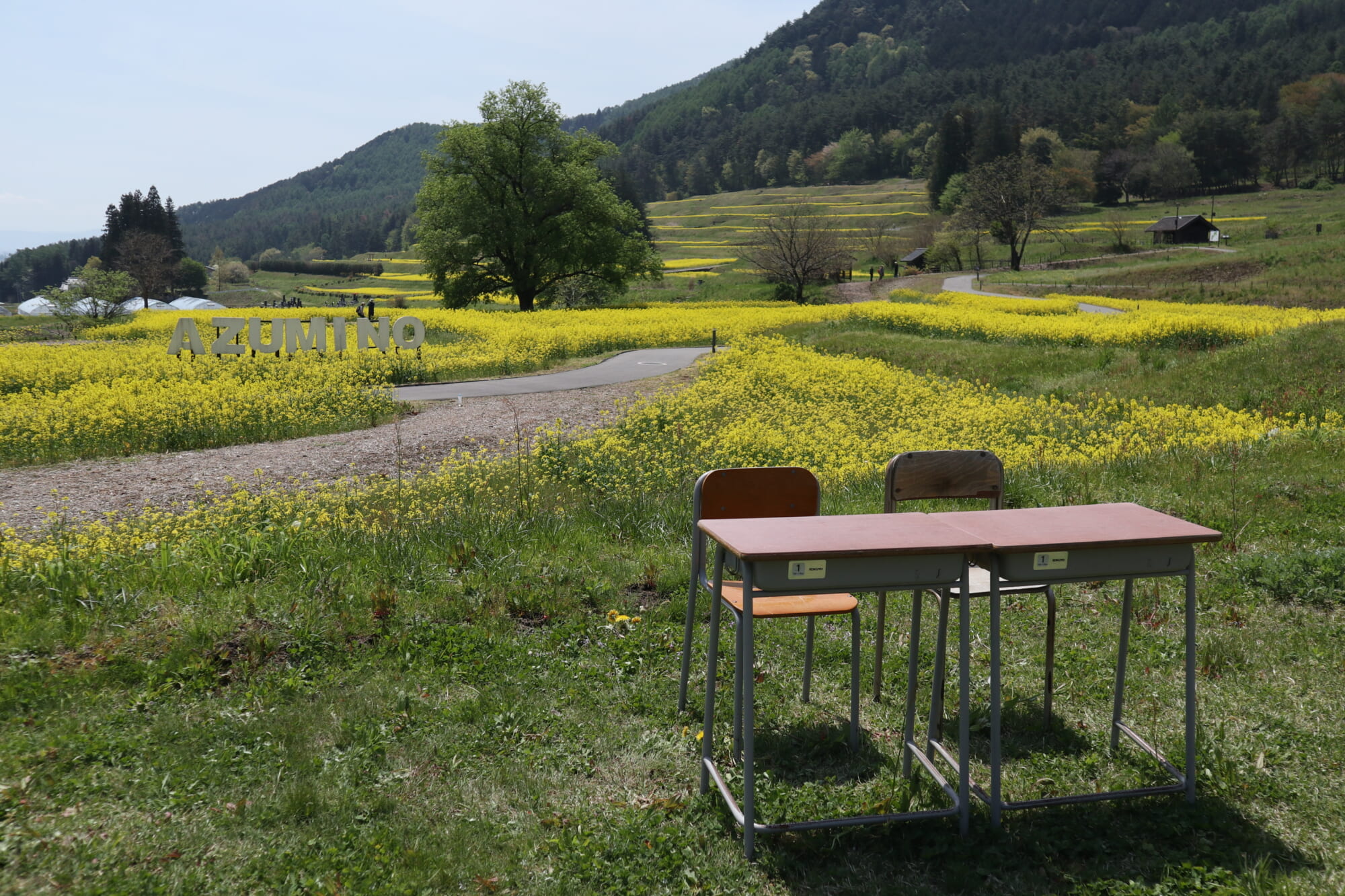 里山文化ゾーンに広がるナノハナ畑は、6ha・500万本という圧倒的な規模。黄色い花が視界の端まで続く開放感は、広大な公園内でもとりわけ印象的な場面です。レトロなデザインのベンチとバス停、懐かしさのある机と椅子など、撮影を楽しめるフォトスポットも各所に点在しています。