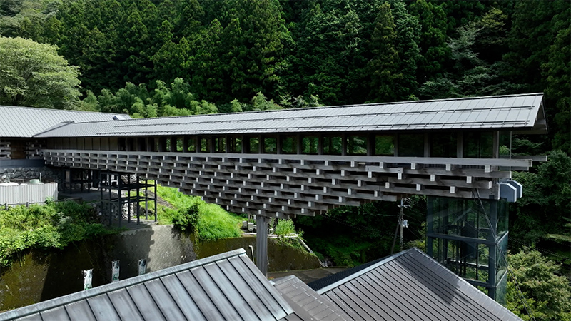 その名の通り、まるで雲の上にいるような浮遊感をテーマにデザインされ、木材をふんだんに使用した独特の構造が特徴。建物自体が芸術作品であり、吊り橋のように湾曲した廊下が、隣接する温泉施設や宿泊施設とを結んでいます。訪問者にとって「展望台」であり「アート」になる不思議な建築物は、単に作品を見るだけでなく、建築を通して梼原町の自然や光と対話できる体験が最大の魅力です。建築ファンをはじめ、建築に詳しくない人でも圧倒されるスポットです。