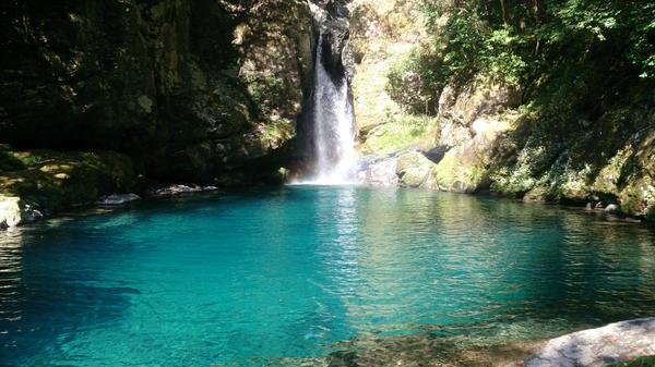 にこ淵は、仁淀川の支流に位置する、「仁淀ブルー」を象徴する神秘的な淵です。周囲を深い森に囲まれた人里離れた場所にあり、特定の時間帯に太陽光が差し込むと、水面が息をのむような鮮やかなコバルトブルーに輝きます。