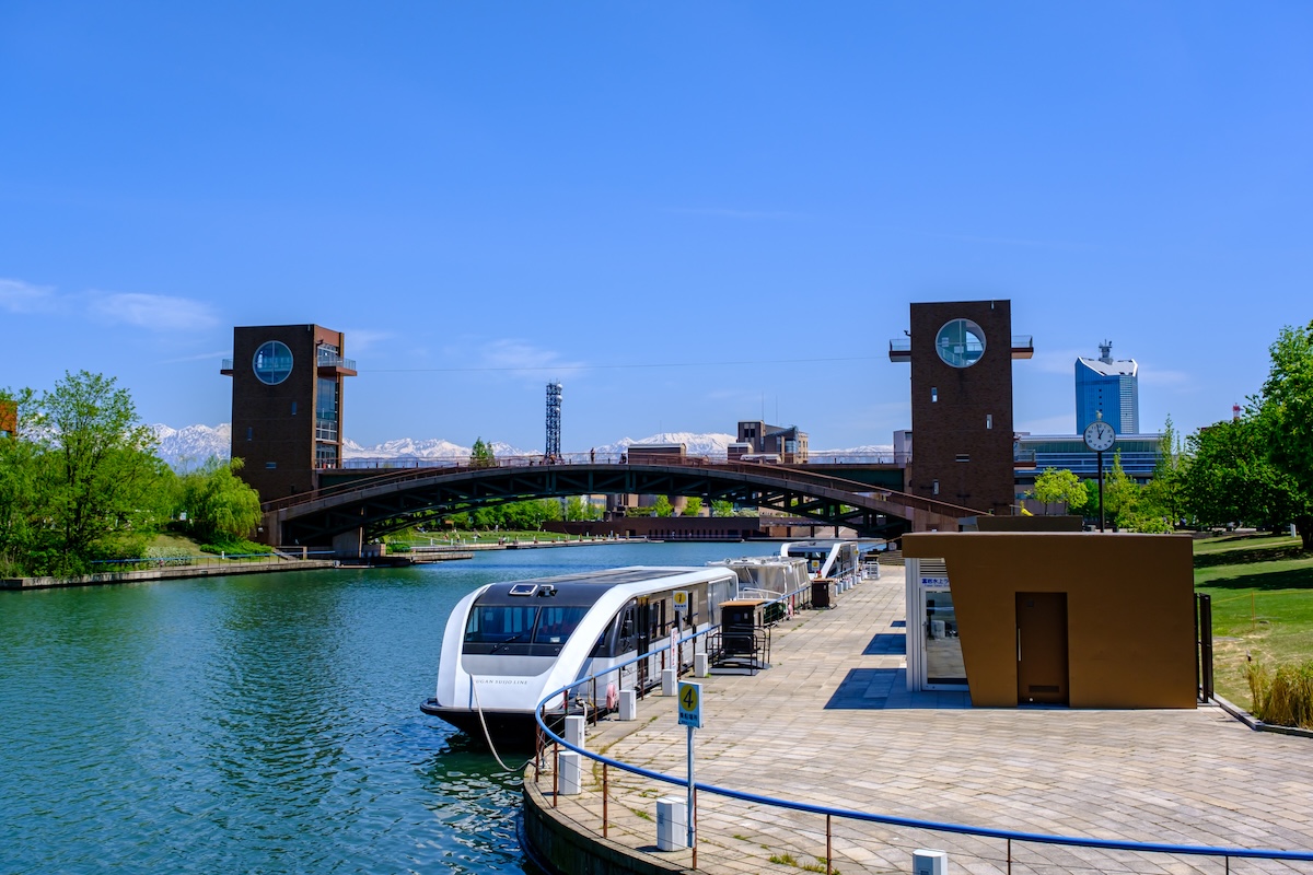 富山の海の幸でお腹を満たしたあとは、路面電車またはタクシーで約15分移動して富岩運河環水公園に向かいます。