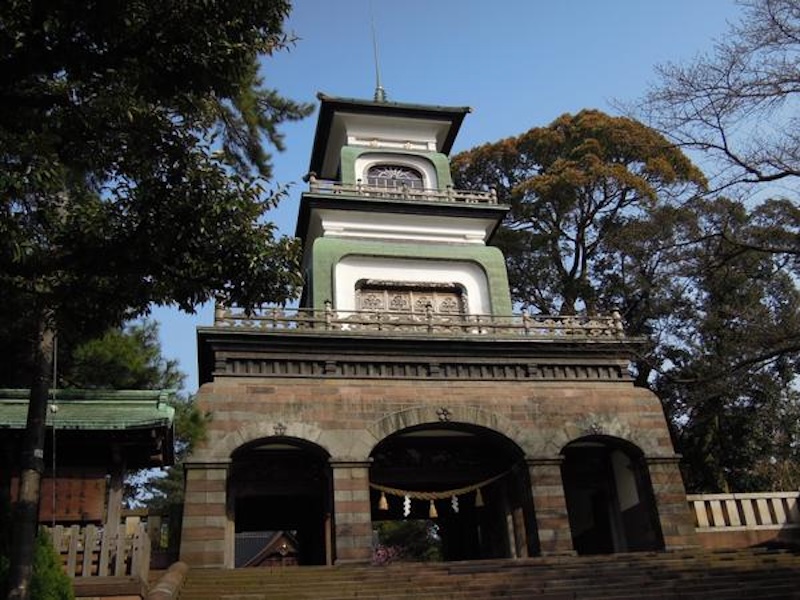 加賀藩の藩祖・前田利家公を祀る「尾山神社」は、神社の概念を覆す独創的な建築美が際立つスポットです。最大の特徴は、和・漢・洋の3つの様式が融合した「神門」。最上階の窓にはめ込まれた美しい色鮮やかなステンドグラスは、夜になると明かりが灯り、かつては日本海を航行する船の灯台代わりになったという逸話も。