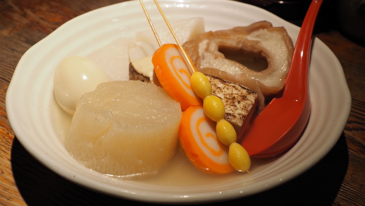2日目のランチは、1日目と同じく活気あふれる近江町市場周辺へ。このエリアには、地元客にも愛される「金沢おでん」の名店が点在しています。カニ面やバイ貝、車麩といった金沢ならではの具材を、上品な出汁で煮込んだおでんは、滋味深く体の芯から温まる美味しさです。
