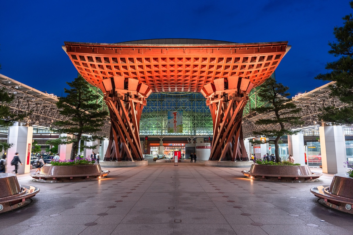 旅の始まりは金沢観光の玄関口「金沢駅」から。世界で最も美しい駅の一つに選ばれたこともあり、伝統芸能の鼓を模した「鼓門」と、雨傘をイメージしたガラス張りの「もてなしドーム」が訪れる人を温かく迎えてくれます。フォトスポットとしても人気で、多くの観光客がその壮大な建築美に足を止めます。