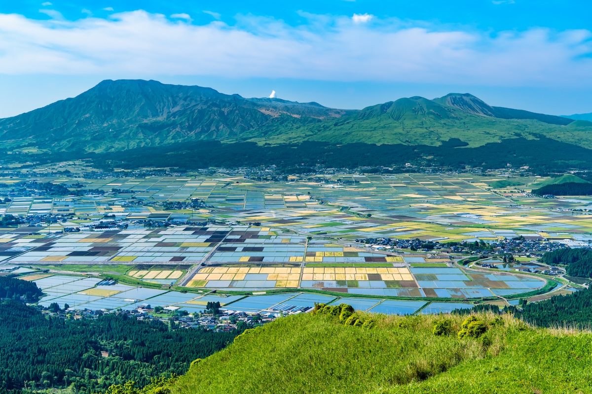 阿蘇外輪山の最高峰に位置する「大観峰」。ここから望む阿蘇五岳は、お釈迦様が横たわっているように見えることから「涅槃像」と称され、その圧倒的なスケール感に言葉を失います。360度見渡す限りの大パノラマには、カルデラ内に広がる田畑や集落、そして幾重にも重なる外輪山の山筋が刻まれ、火山の巨大なエネルギーと人の営みが共存する奇跡を感じずにはいられません。