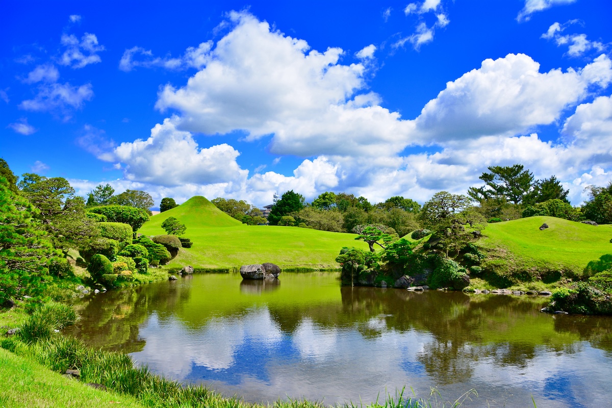 肥後細川藩の歴代藩主によって築かれた「水前寺成趣園」は、阿蘇の伏流水が湧き出る池を中心とした桃山様式の回遊式庭園です。東海道五十三次を模したとされる造園が見事で、中でも富士山を象った美しい築山は、見る角度によって表情を変える庭園のシンボル。一歩足を踏み入れれば、市街地の喧騒を忘れるほどの静寂と、透明度の高い水面に映る緑に圧倒されます。