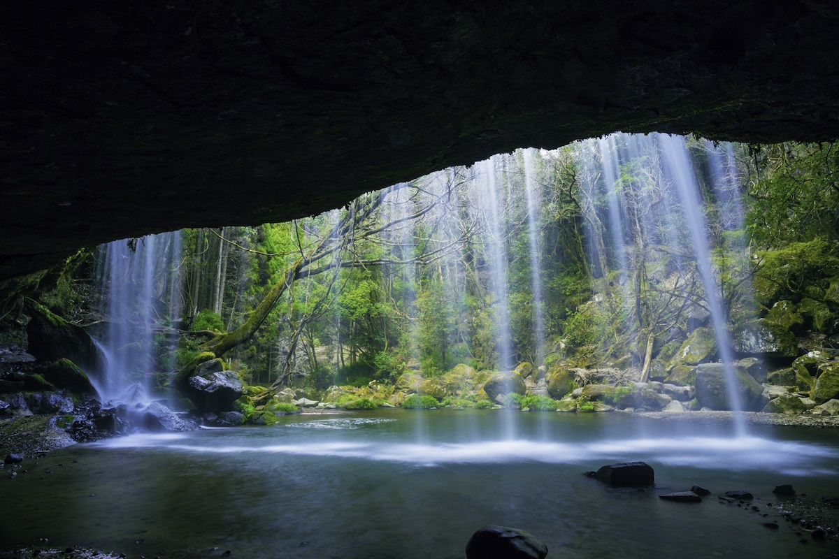 阿蘇の巨大噴火が造り出した「水のカーテン」を裏側から眺める、神秘的な体験ができるのが鍋ケ滝公園です。お茶のCMのロケ地としても有名ですが、その真価はカーテン越しに差し込む木漏れ日の美しさにあります。滑らかな岩肌を幾筋もの水が流れ落ちる様子は、まるでシルクのような質感。滝の裏側は広く削られており、マイナスイオンを全身に浴びながら、水の衣を纏ったような幻想的な世界に浸れます。