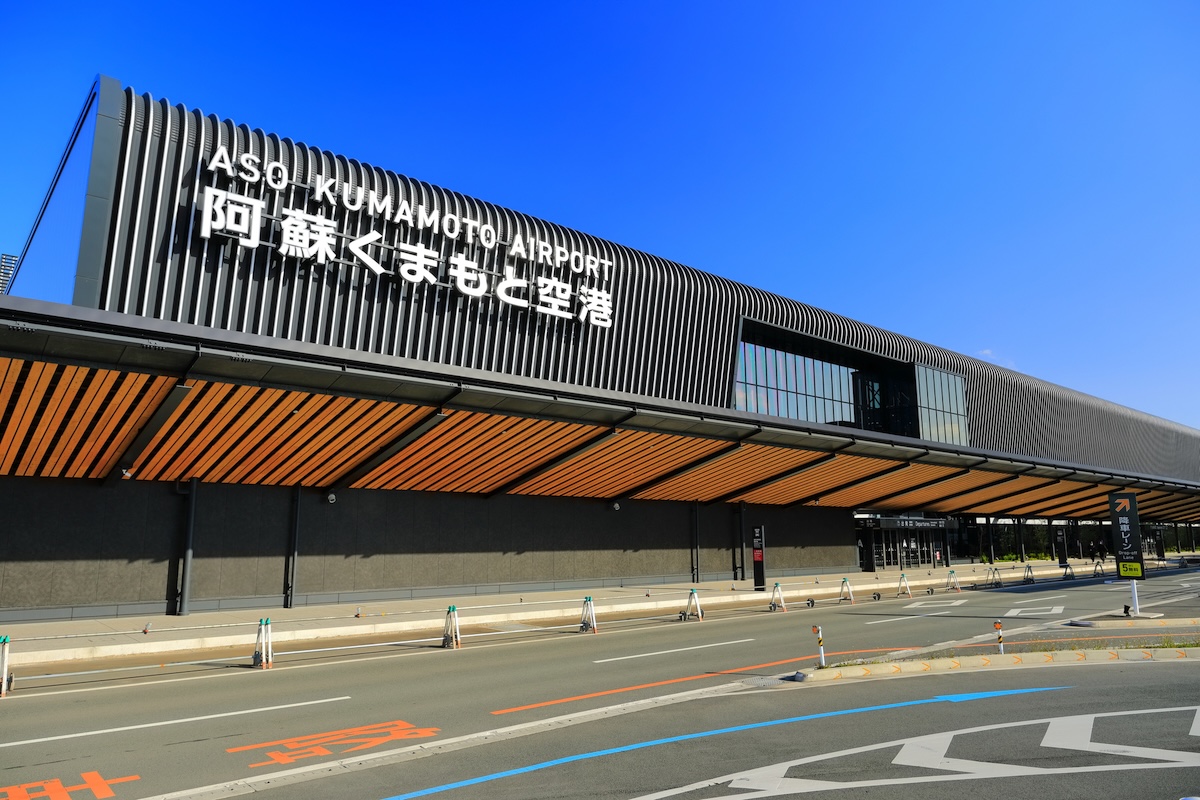 今回の旅のスタートは熊本空港から。2023年に新旅客ターミナルが誕生した「阿蘇くまもと空港」は、阿蘇の木材を多用した温もりあるデザインと最新機能が融合した、まさに「旅の起点」と呼べる空間です。熊本グルメや買い物を楽しめる商業施設が非常に充実しており、到着した瞬間からこの土地のエネルギーを感じられるでしょう。