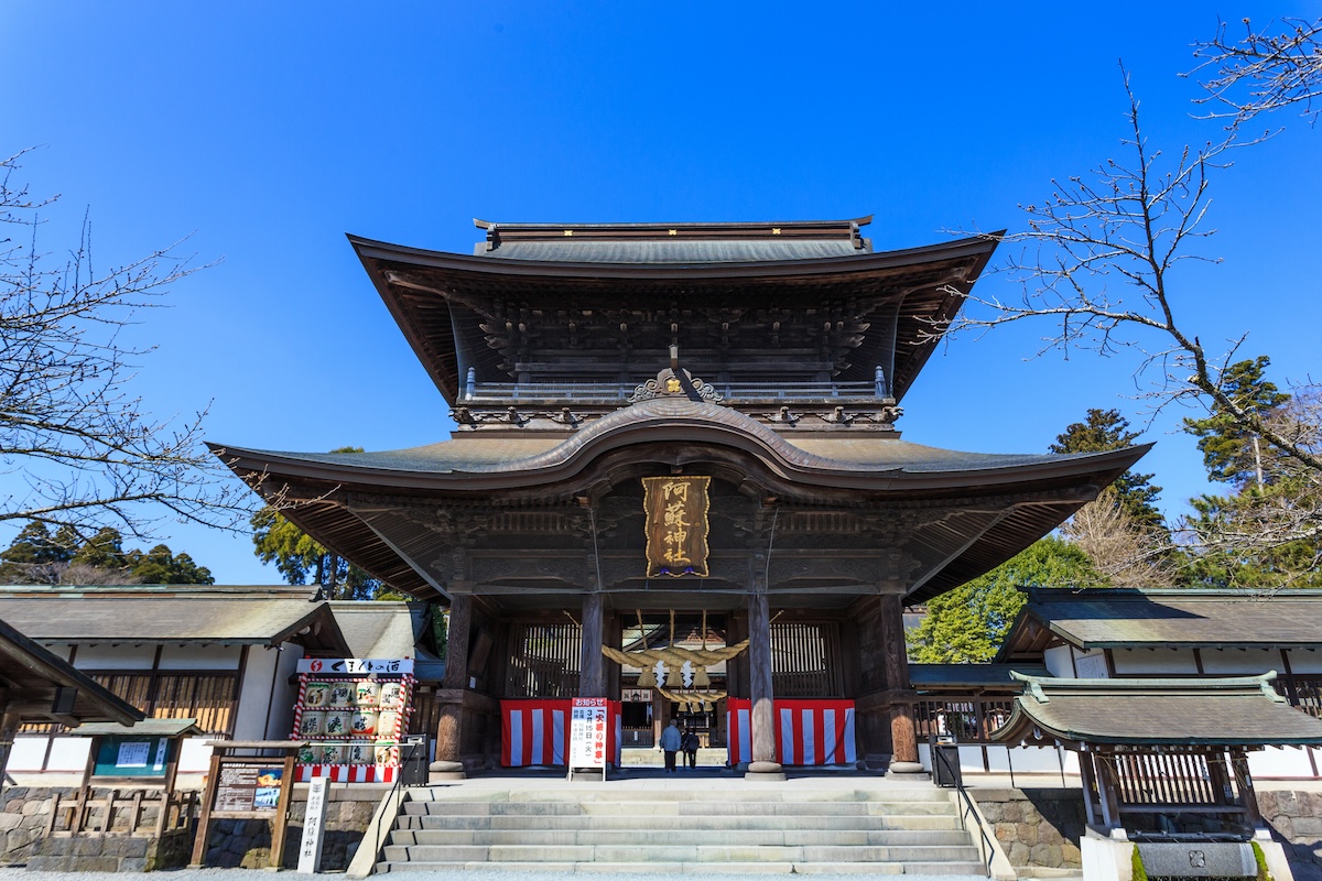 約2,300年の歴史を誇る「阿蘇神社」。全国に約500ある阿蘇神社の総本社であり、阿蘇開拓の祖を祀る由緒ある古社です。最大の特徴は、社殿に対して横に伸びる「横参道」という珍しい構造。震災から見事に復興を遂げた荘厳な楼門は、不屈の精神のシンボルとして再び威風堂々たる姿を見せています。