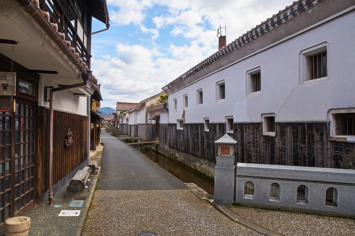 玉川沿いに並ぶ白壁土蔵群は、赤い瓦(赤瓦)と黒い焼き杉の腰板、そして白い漆喰壁のコントラストが特徴です。かつて醤油醸造所や酒造蔵として使われていた建物は、現在、地元の工芸品店やカフェ、ギャラリーとして活用されており、当時の風情を色濃く残しています。