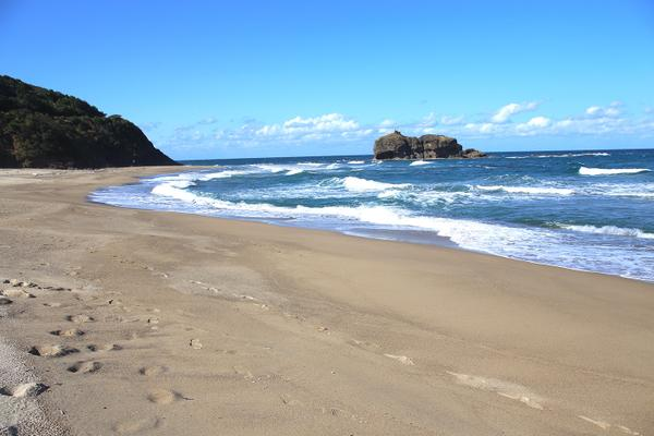 「白兎海岸」は、神話「因幡の白うさぎ」の舞台として知られる弓ヶ浜状の美しい海岸です。この海岸の最大の特徴は、沖合に浮かぶ「淤岐ノ島(おきのしま)」と、そこから岸へ向かって点々と続く岩礁の列です。