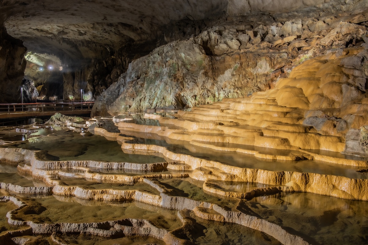 秋芳洞は秋吉台国定公園の地下100mにある巨大な鍾乳洞です。総延長は11.2km以上あり、鍾乳洞としては日本最大規模で、日本の特別天然記念物に指定されています。鍾乳洞とは、雨水が岩の割れ目から地下に流れ込み、石灰岩を溶かしてできる洞窟です。秋芳洞も百万年にわたる地下水による溶食作用と地下水位の低下、砂や礫の堆積、天井の崩落、洞窟生成物の発達によってできあがったと考えられています。