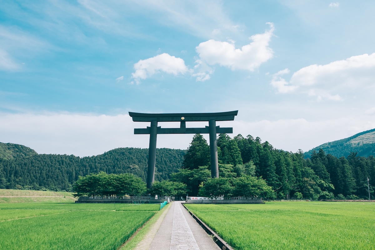 「大斎原(おおゆのはら)」は、熊野本宮大社が明治時代まで鎮座していた旧社地です。現在は、高さ約34メートル、幅約42メートルという日本最大級の巨大な鉄筋コンクリート造の鳥居が、田園風景の中にそびえ立つ和歌山を代表する名所の一つになっています。