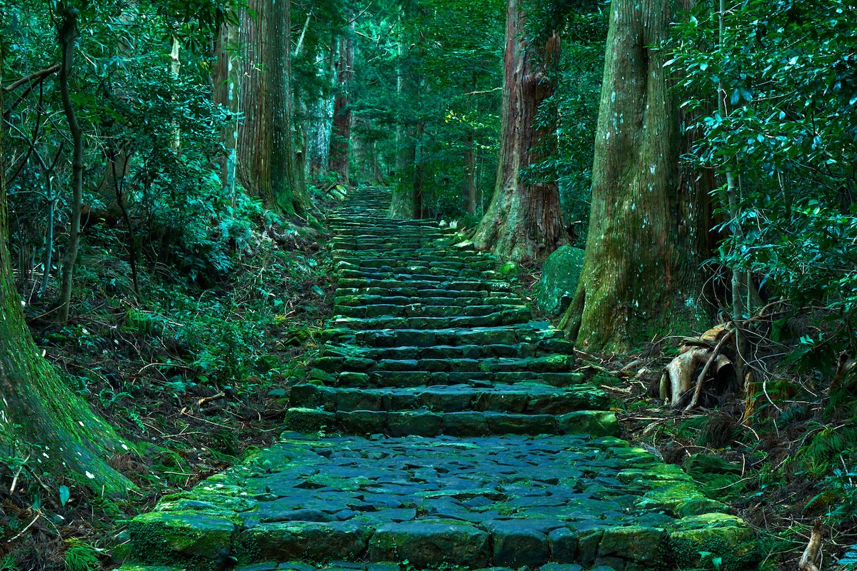 坂の入り口には、樹齢約800年、幹周り8.5メートルにおよぶ巨大な「夫婦杉」がそびえ立ち、参拝者を迎えます。一帯は鬱蒼とした杉林に囲まれ、雨の多い熊野の気候に適した石組みの技術が現在も維持されています。