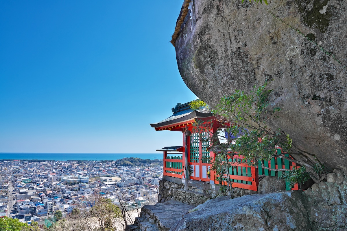 「神倉神社」は、熊野の神々が最初に降臨した地と伝えられる、熊野速玉大社の摂社です。権現山の中腹に位置し、御神体である巨大な奇岩「ゴトビキ岩」が、今にも崖から落ちそうな姿で鎮座しています。