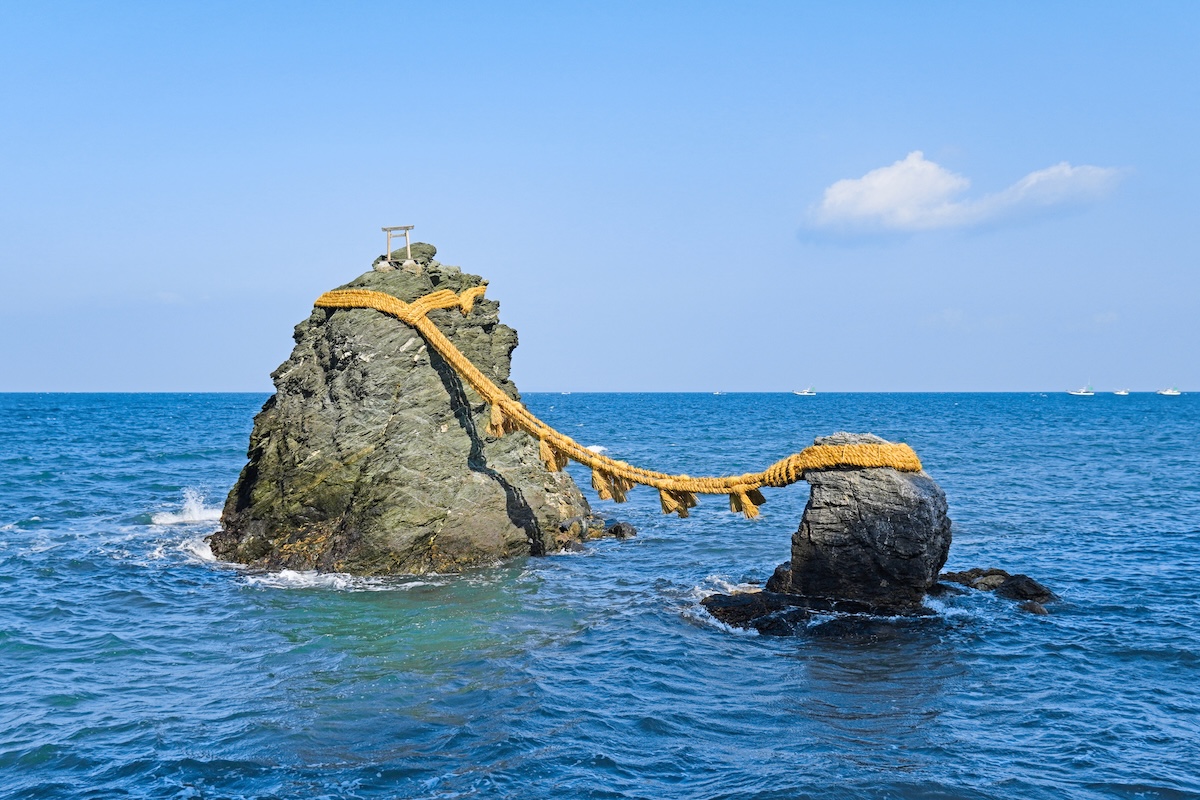 神社は、縁結びや夫婦円満、交通安全のご利益があるとされています。海に浮かぶ夫婦岩は、大岩(男岩)と小岩(女岩)が長さ35mの注連縄で結ばれています。お伊勢参りに訪れた人が、最初に訪れる禊の地とされ、古くは夫婦岩が見える立石浜で体と心を清めてから外宮、内宮を回っていました。