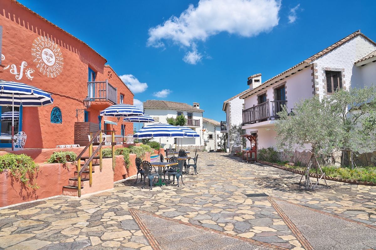 志摩地中海村は、英虞湾を望む絶景とともに、地中海の美しい街並みを再現したリゾート施設です。施設内は「アンダルシア」「カスティーリャ」「サルジニア」「アルハンブラ」「ミコノルカ」の5つのエリアで構成され、スペイン南部の華やかな港町や、ギリシャ・ミコノス島の白壁の街並みなど、まるで本当に地中海を旅しているかのような気分に浸れます。